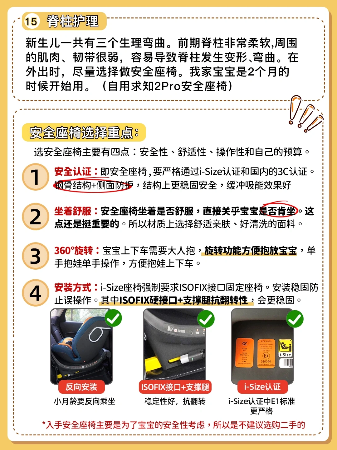 🔆宝宝脊柱护理:新生儿一共有三个生理弯曲。前期脊柱非常柔软,周围的肌肉、韧带很弱,容易导致脊柱发生变形、弯曲。在外出时,要选择C型座舱的安全座椅,可以更贴合新生儿身型,起到支撑和保护的作用。