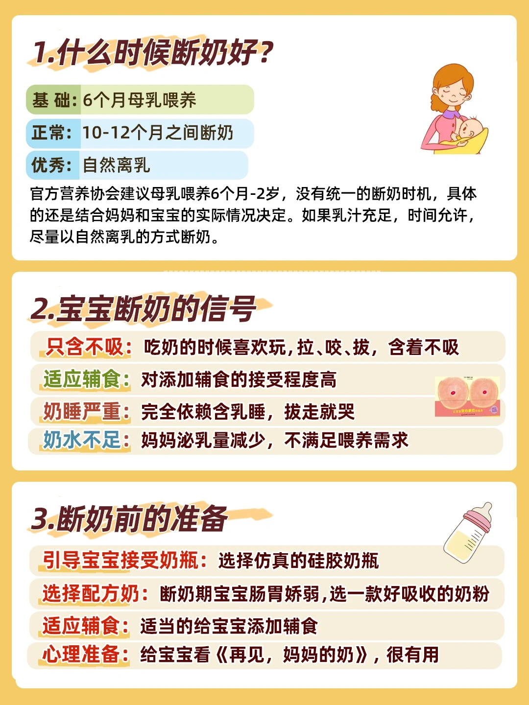 断奶的信号、断奶的准备(宝宝和麻麻)、科学断奶方法都总结到图上了👆,大家可以详细看看。然后我来重点讲讲让妈妈头疼的事😱如何正确离乳👀