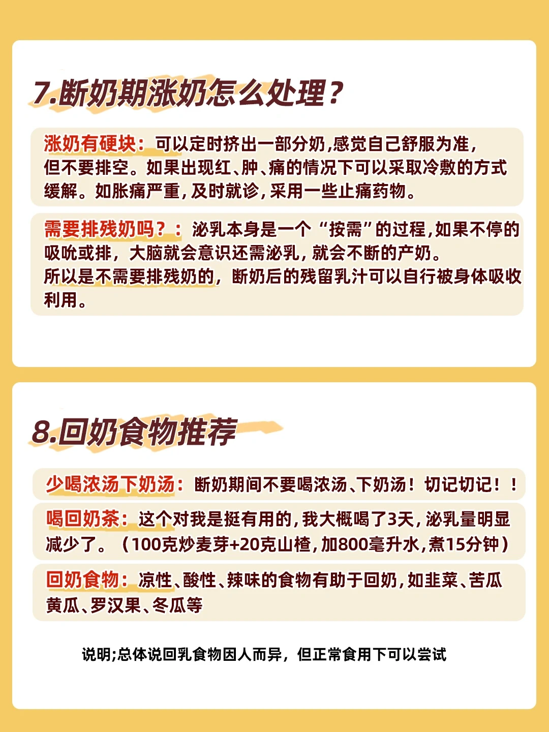 ✅少喝汤汤水水:前3天很关键,能少喝就尽量少喝,整个断奶期间不要喝浓汤、下奶汤!切记切记❗可以准备一些回奶茶,也可以吃一些回奶食物像,韭菜、芹菜、苦瓜、罗汉果、冬瓜等。