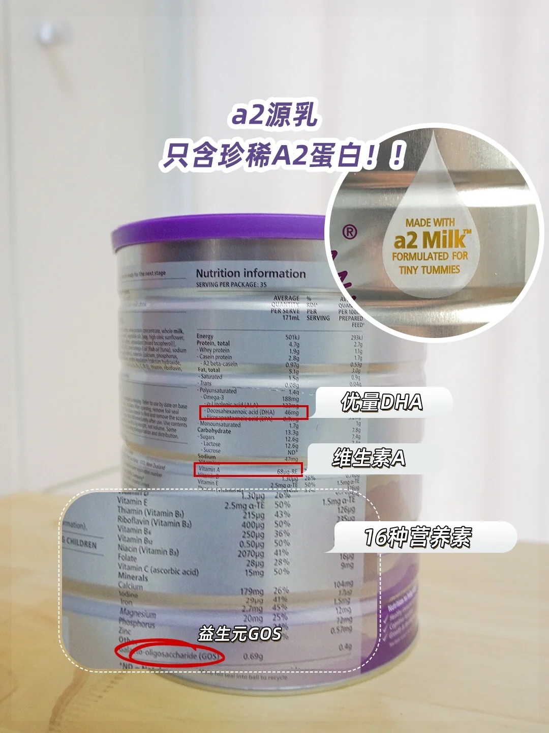 a2通过DNA筛选技术选出西方仅有约30%的A2奶牛🐄在经过一系列的监测和检验技术确保👉它的a2源乳只含珍稀A2型蛋白质🙋这是天然的酪蛋白👀亲和好吸收,再搭配提高自护力的益生元GOS,呵护小汤圆娇嫩的小肚肚