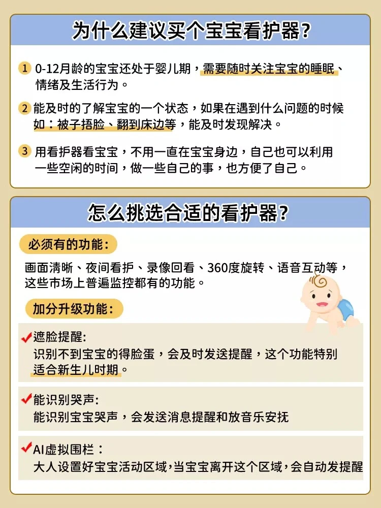 2.三大看护模式:睡眠/客厅/分床看护,根据不同月龄选择不同的看护模式;