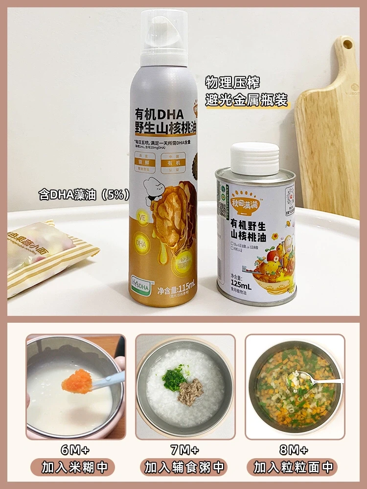 之后多种植物油轮换着吃,刚开始我给我家宝挑选了秋田满满核桃油,味道清淡,亚麻酸和亚油酸比例适中,配料简单(纯核桃)适合初添加辅食油的宝宝。平时在宝宝辅食米糊和辅食粥都添加一两滴。后面又入手他们家的DHA核桃油,添加了藻油DHA,不饱和脂肪酸高达93.7%,营养丰富,而且喷头定量设计,能很方便掌握用量,小火煎东西很方便。之后可以在搭配烟点比较高的热炒油使用~