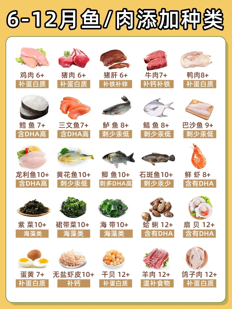 🍤鱼/肉类:鸡肉、猪肉、猪肝、牛肉、鸭肉、鳕鱼、三文鱼、鲈鱼、虾、紫菜、裙带菜、蛋黄等