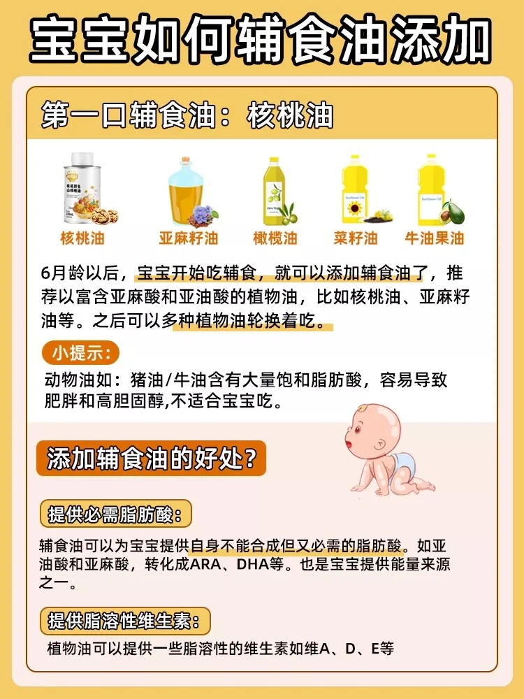 6月龄以后,宝宝吃辅食一段时间,就可以添加辅食油,推荐以富含亚麻酸和亚油酸的植物油,比如核桃油、亚麻籽油等。