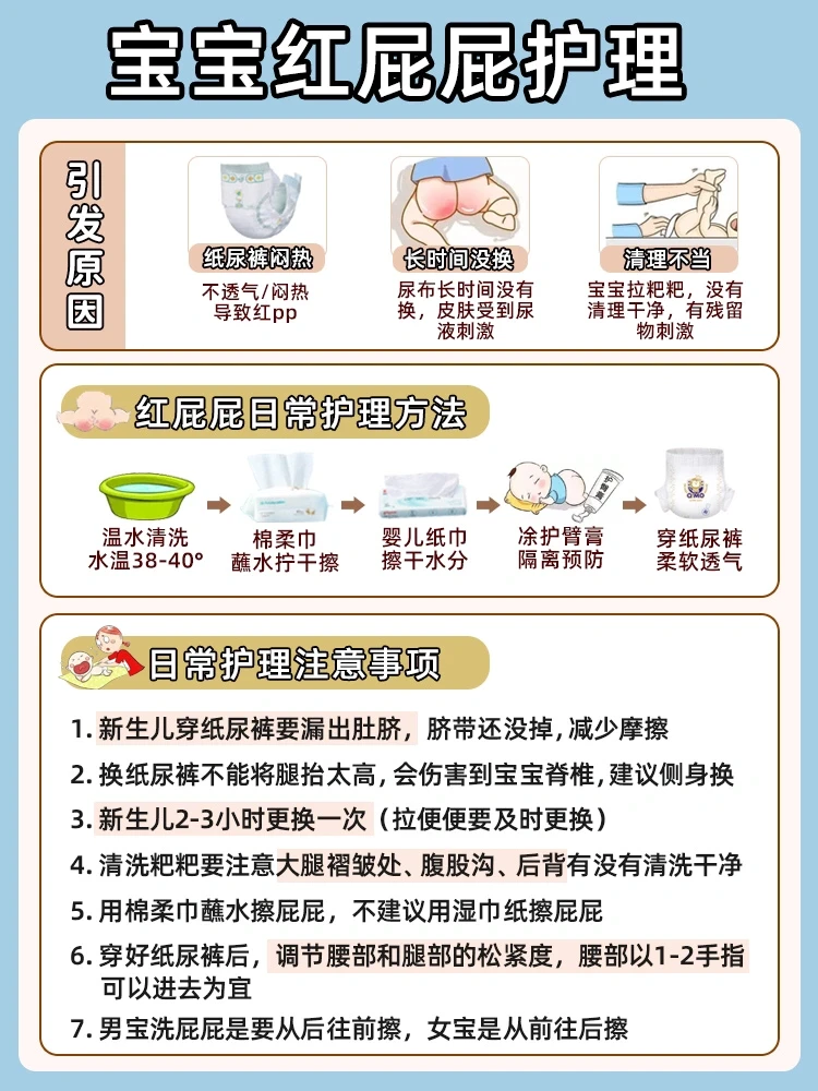 1.准备38度温水—棉柔巾蘸水拧干擦—用婴儿纸巾擦干水分—涂护臂膏隔离——选择柔软透气纸尿裤