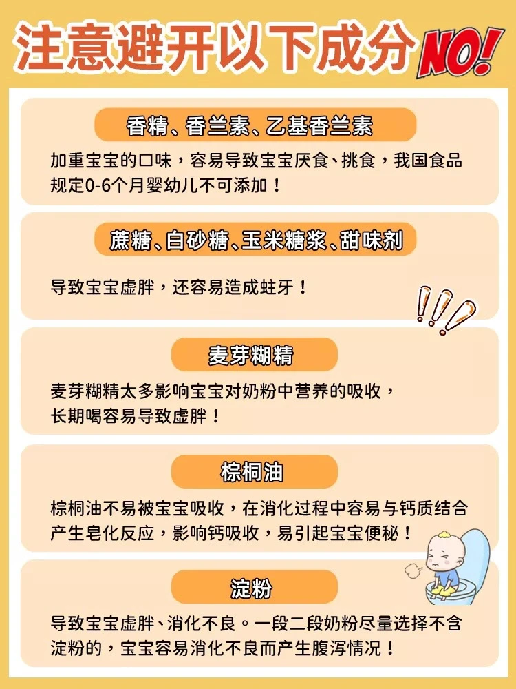✅四、避开不友好成分:如蔗糖、香兰素、甜味剂、麦芽糊精、淀粉等。