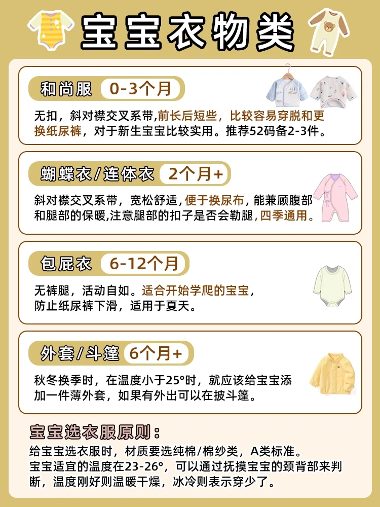 1.款式:和尚服(0-3个月)、蝴蝶衣/连体衣、包屁衣、外套,一般新生儿从出生到第3个月都是用包巾包裹着,一般选购和尚服和蝴蝶衣各2-3件就行,比较宽松舒适,也好换尿布。