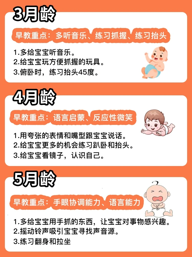 早教重点:多听音乐、练习抓握、练习抬头