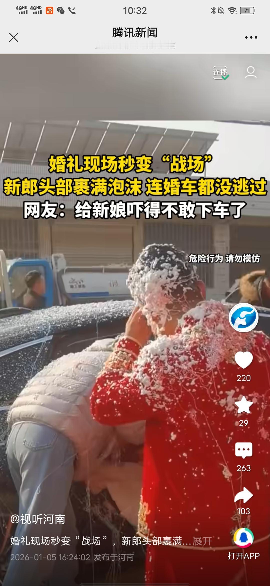 恶俗!婚礼现场秒变“战场”,新郎头部裹满泡沫,连婚车都没逃过! 视听河南报道的消息,在1月5日,在山东,一对新人结婚,他们身穿红色礼服,本来是喜庆祥和幸福开心的日子,结果从视频中看到,穿着红色礼服的新郎,满身满脸都被喷上了白色泡沫,脸上也全是,眼睛都看不到路了,一边靠近婚车,一边不停在脸上扒拉抓下挡住视线的泡沫,嘴上也是,连着扒拉了好几下才看清前路,往婚车靠近,婚车上也被喷满了泡沫,新娘见状都不敢下车了。只见另一身穿米白色棉服的人过去帮忙搀扶。 说真的,可能跟我自己的性格有关,我极其讨厌这样的所谓喜庆的婚闹,本来结婚当天新郎新娘应该是最美最幸福的日子,结果被所谓的婚闹搞得狼狈不堪。 另外,这样的泡沫有燃爆的风险,使用之人有没有这样的常识?万一发生危险怎么办?谁能负这个责任?如果真的是亲朋,那就应该让人家开开心心,漂漂亮亮,端庄从容地过好这一天,可以制造些让人印象深刻的美好游戏,但是这样不知分寸的恶俗婚闹,真的让人厌恶。习俗应该是良好的美好的,值得传承让人舒服的,绝不是这野蛮,没有素质没有文化不讲文明的恶搞!友友们觉得呢?