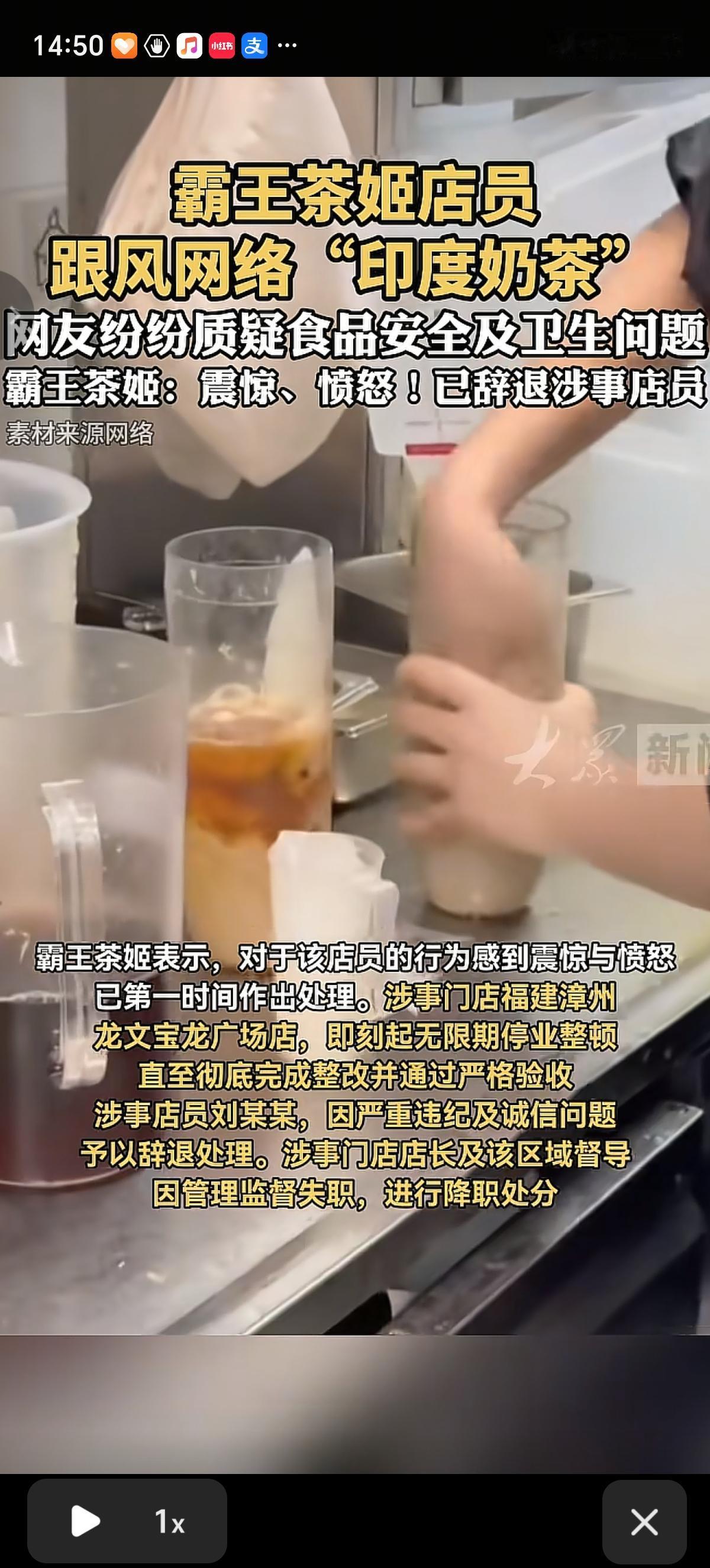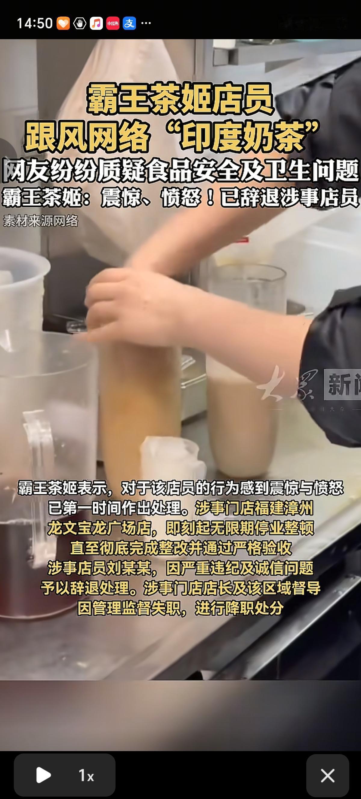 这个霸王姬奶茶店的员工是有点虎劲在身上的,虽然知道她是在跟风“印度奶茶”,她也被辞退了,但看了还是有生理性不适,被恶心到了,诱发了对霸王姬在内的其他奶茶的担心。 霸王茶姬漳州龙文宝龙广场店店员在制作饮品时,模仿网络上的“印度奶茶”制作方式,用徒手直接搅拌、接触饮品原料,全程未遵循食品加工卫生规范,网友质疑其存在严重食品安全与卫生问题。 该门店被无限期停业整顿,需完成整改并通过验收才能复业。 虽然整改的速度挺快,但个人感觉未来一年都不想喝奶茶了,完全没有想法了。