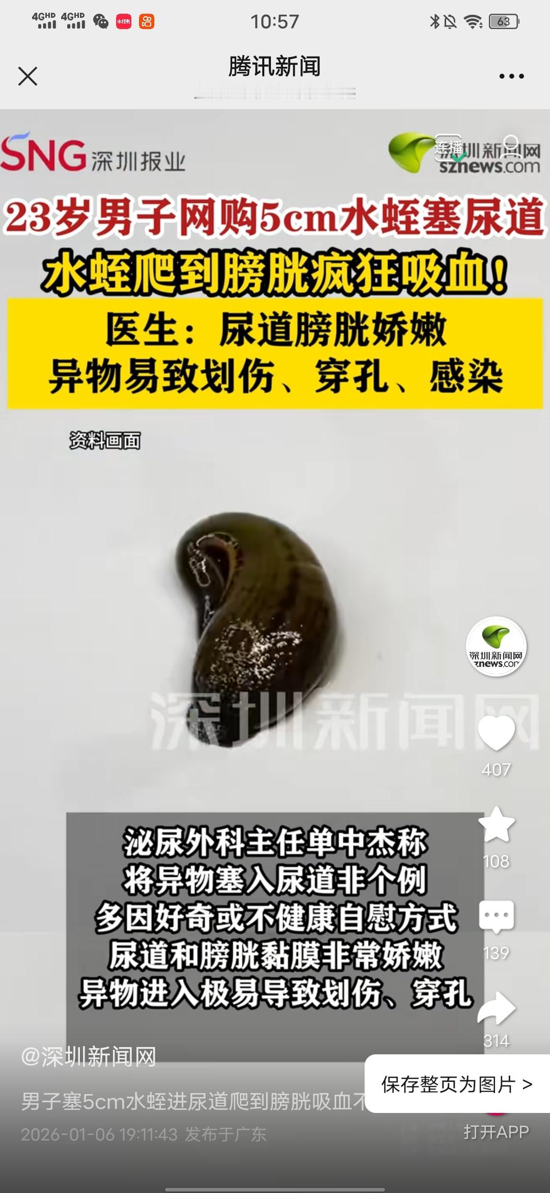 真是旷古奇闻,太奇葩了! 男子塞5cm水蛭进尿道爬到膀胱吸血不止! 来自深圳新闻网的报道,1月6日,郑州市人民医院公布一个病例,23岁小郑,出于猎奇,网购活体水蛭,塞入尿道,很快出现疼痛难忍还排尿困难,水蛭还爬进膀胱吸血,释放抗凝血物质。就医后,医生为其取出一只5-6厘米的严重充血的水蛭,然后小伙的症状才得到解除。 友友们看到这里是不是也觉得不可思议,什么样的思想让人做出这样奇葩的行为?不知道水蛭是什么东西吗?简直不知所谓! 小时候,下水田割油菜,插秧时,常常见到这些东西,那时就很害怕皮肤上会黏上这些脏东西,所以印象深刻,长大后,虽然很多很多年不再下田干活,但是还是常常会见到,特别是夏天的叶子菜上面,很多叶子菜都会爬有那个叫水蛭的东西,所以,我但凡在外就餐,是绝对不会点叶子菜的,因为我知道叶子菜上面多会爬有这些东西,而餐馆又是绝对不会认真清洗的。 很讨厌吧?再告诉大家,油麦菜更容易爬上这些东西,一颗油麦菜大概率会爬上2-3条,所以,夏天买油麦菜的姐妹,一定要认真清理,清洗。 回头来说这个小伙子,他的因为不会让人觉得他勇敢,只会认为他无知,再加上一些讽刺,都是成年的人了,生活要有常识,不要干那些听上去勇猛实质上愚蠢的事,健康才是最该重视和探索的问题。希望经此教训,以后长点心,少干不着调的蠢事。