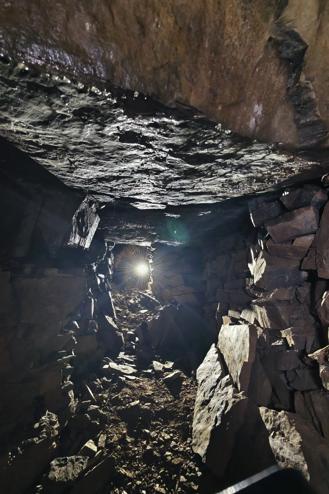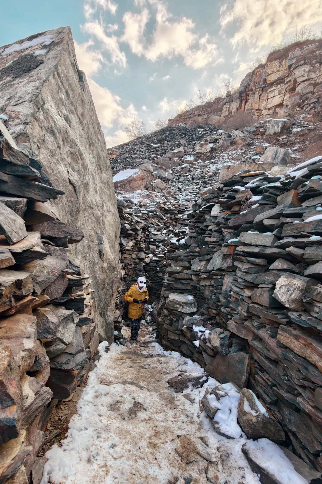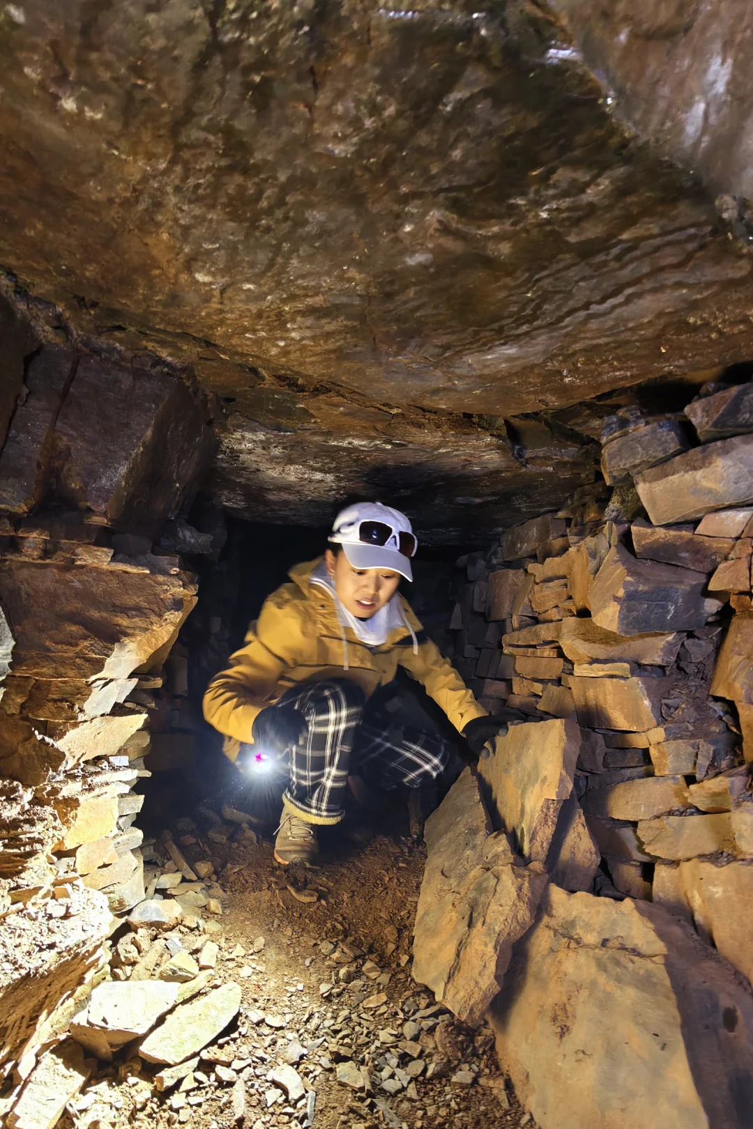 ❹山头2山腰处,有很多的石板洞穴,有的塌了只有石板廊道,有的洞穴还在能进去探洞,长度不长。有的石板洞非常矮小逼仄,得蹲下走,有的稍微高些可直立行走。探洞需到照明设备、洞内很窄需卸包进洞且头容易磕到石板