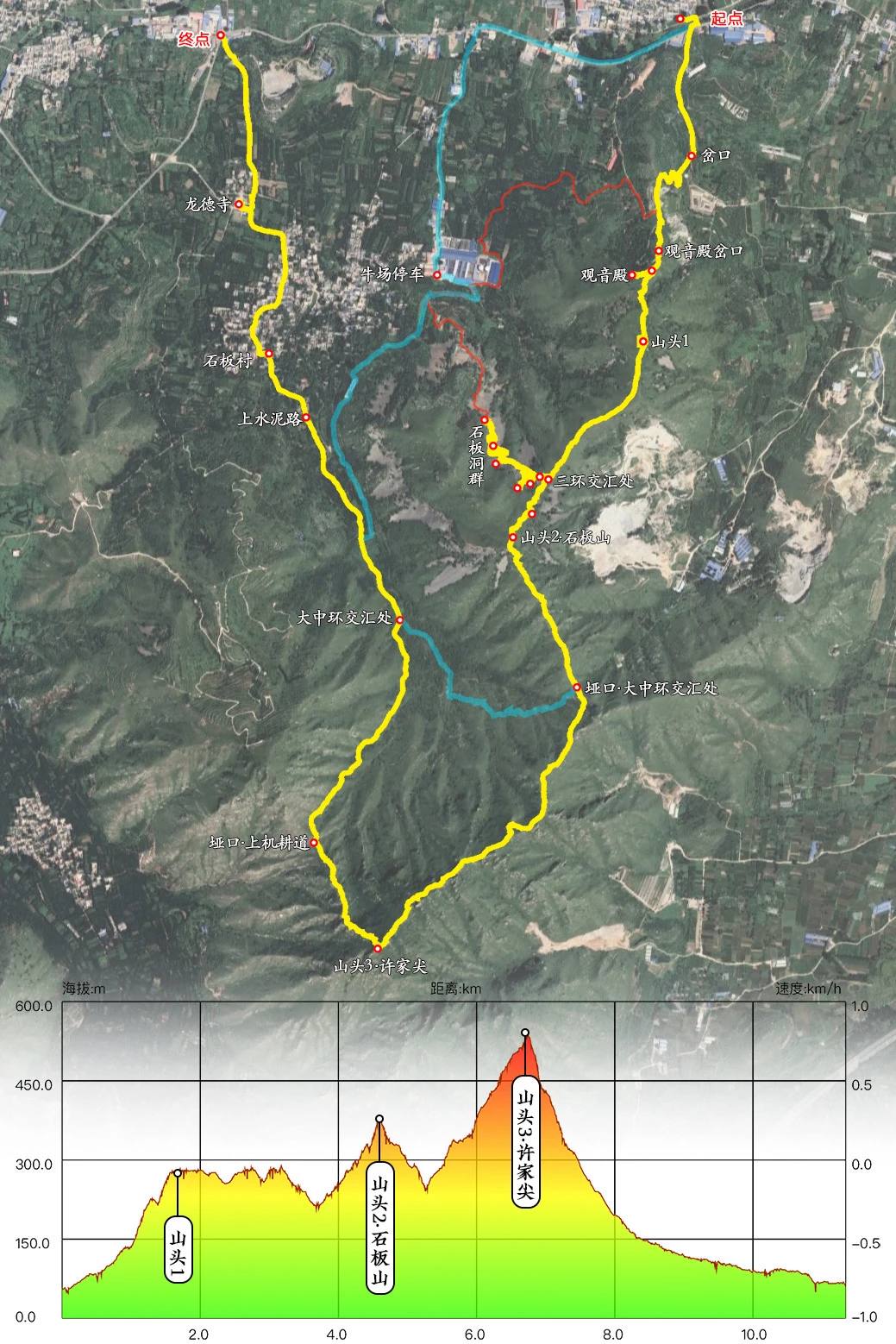 ❶路线成熟,大致可分小(轨迹图-红线)、中(轨迹图-青线)、大(轨迹图-黄线)三种环线走法;小环可直接从牛场停车处作为起终点,里程也就5km左右,偏休闲;中环8km左右;大环去往许家尖山顶10km左右;我们此次走法是大环加上了龙德寺