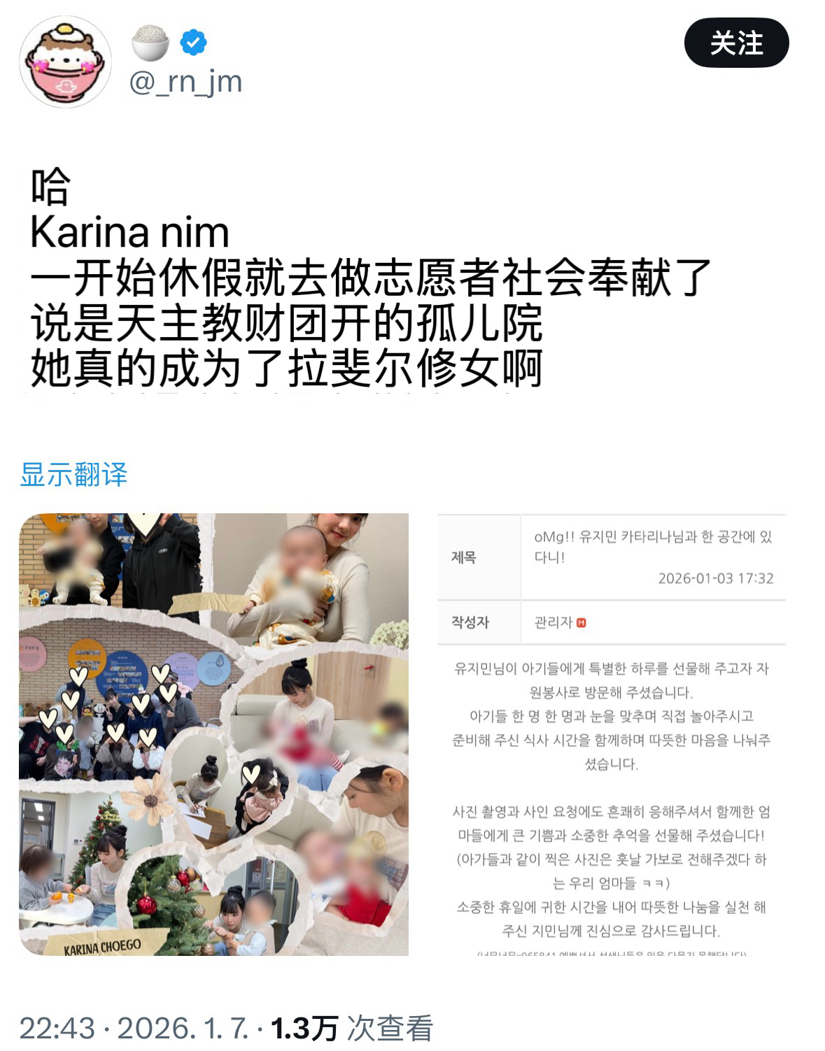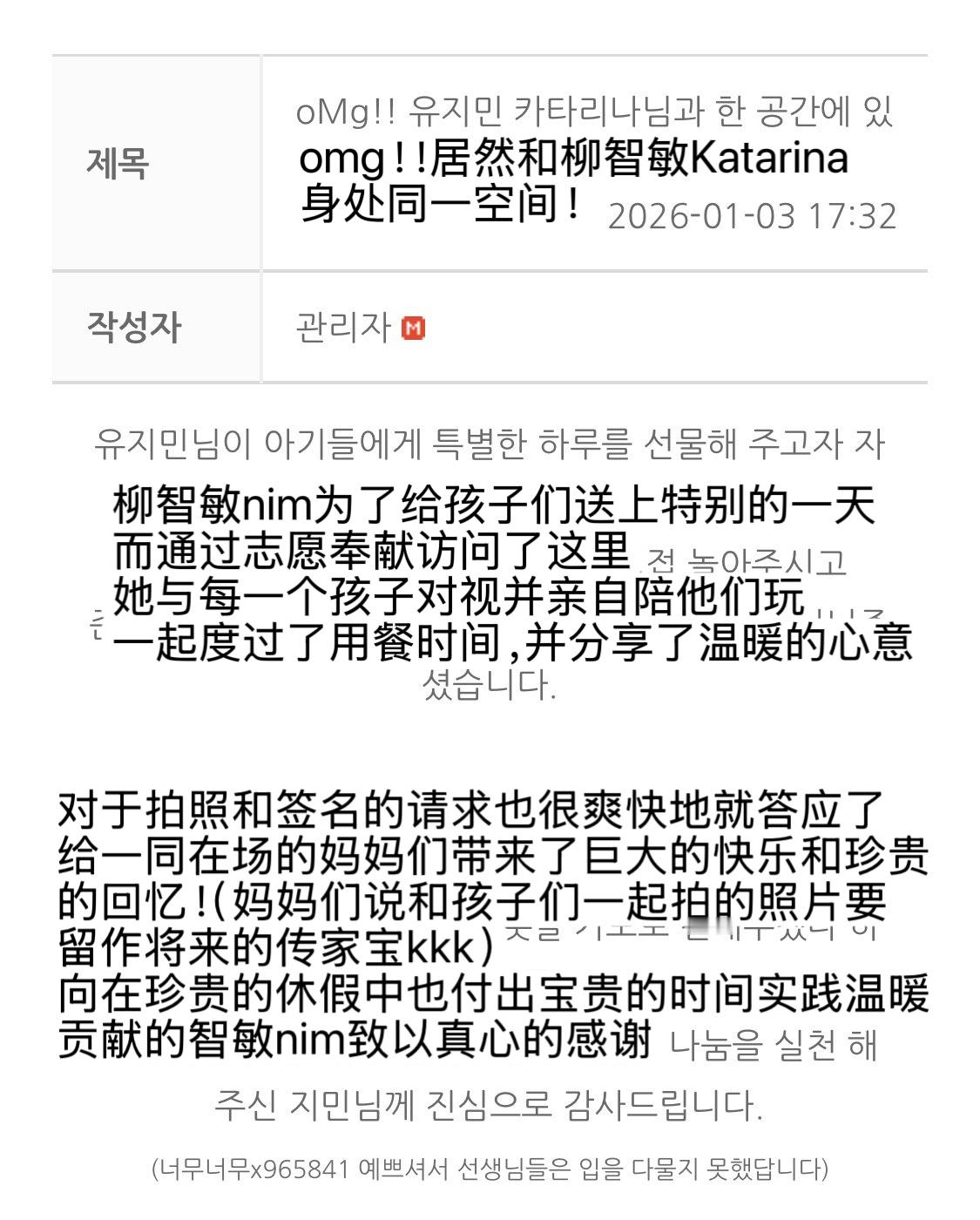 【twi】一开始休假就去孤儿院做志愿活动的aespa柳智敏,人美心善的宝宝