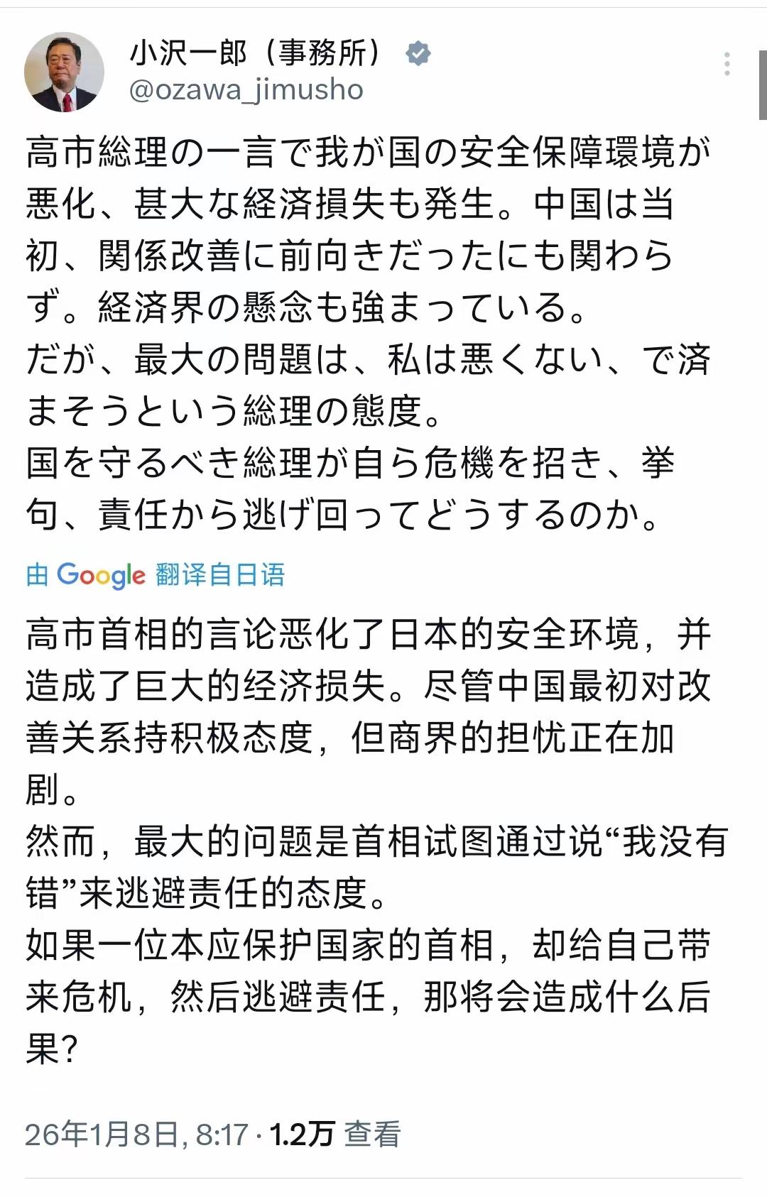 1月8日,日本立宪民主党众议员小泽一郎称:“高市首相的言论恶化了日本的安全环境,并造成了巨大的经济损失。如果一位本应保护国家的首相,却给自己带来危机,然后逃避责任,那将会带来什么后果?” 小泽一郎是日本少有的清醒者,他的言论务实、精准,自高市早苗发表错误言论以来,他已经多次公开批评高市早苗,无奈引不起高市的任何重视。 近几日,中国连续发出重拳之声,面对此种情况,小泽一郎不愿意看到日本在高市早苗的错误言论影响下,越来越多的领域受到干扰,尤其是经济方面的发展,或会带来致命性的后果。 面对进一步激化矛盾的环境,不得不说小泽一郎眼光是犀利的,看问题的角度是长远的,日本承受的经济损失,高市早苗却无任何补救措施,一味地逃避责任,这不是一位首相该有的作派。 高市早苗虽然一直声称与中国对话的大门并未关闭,始终持开放态度。然而,她并没有采取任何可以改变现状的努力,只会让情况变得越来越糟。 如果高市早苗还不能够正确对待当前的一系列反应,那日本遭受的困局在一定时期内是难以解决的,若不撤回错误言论,后续受到的反制将会是持续性的。