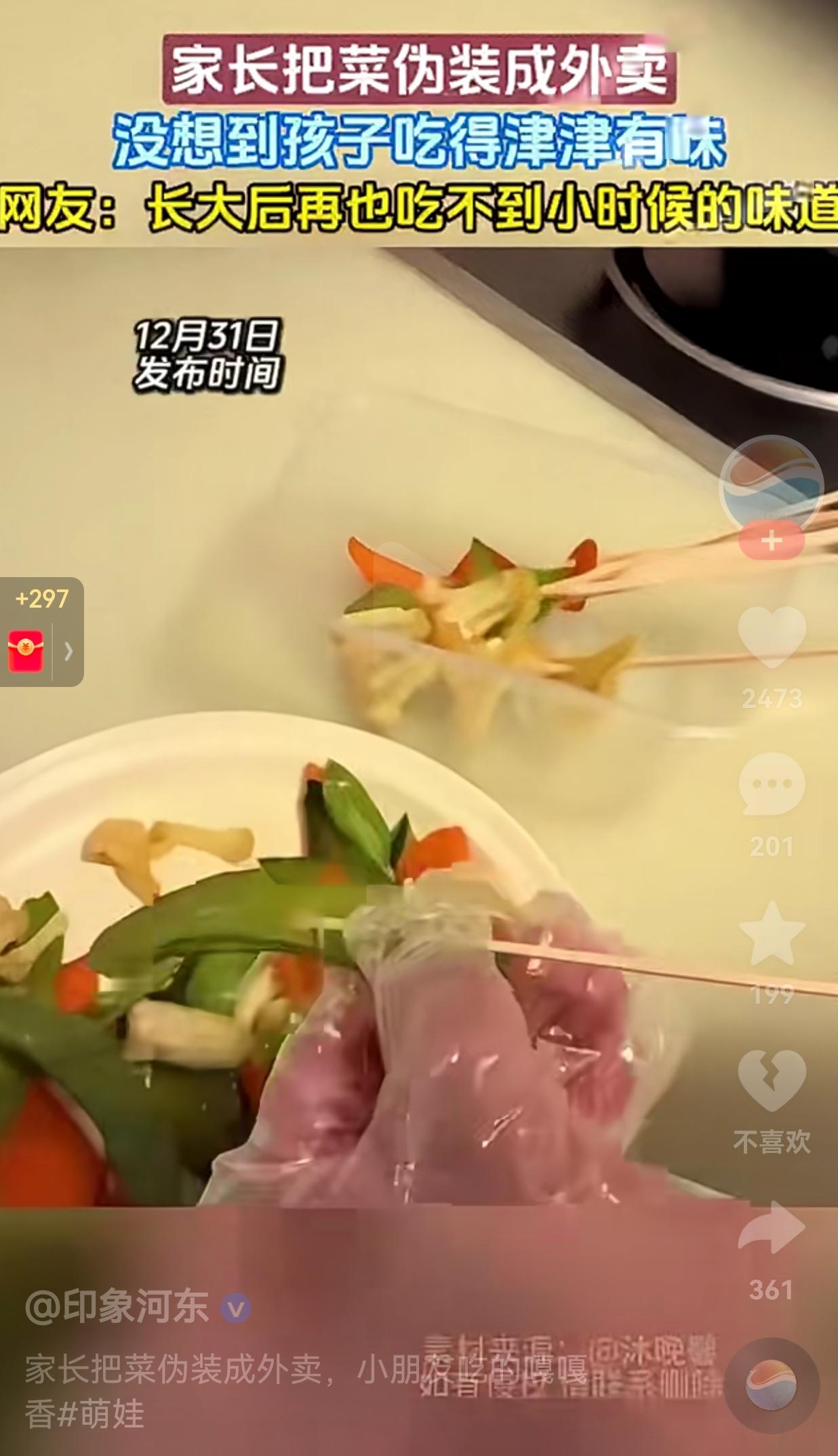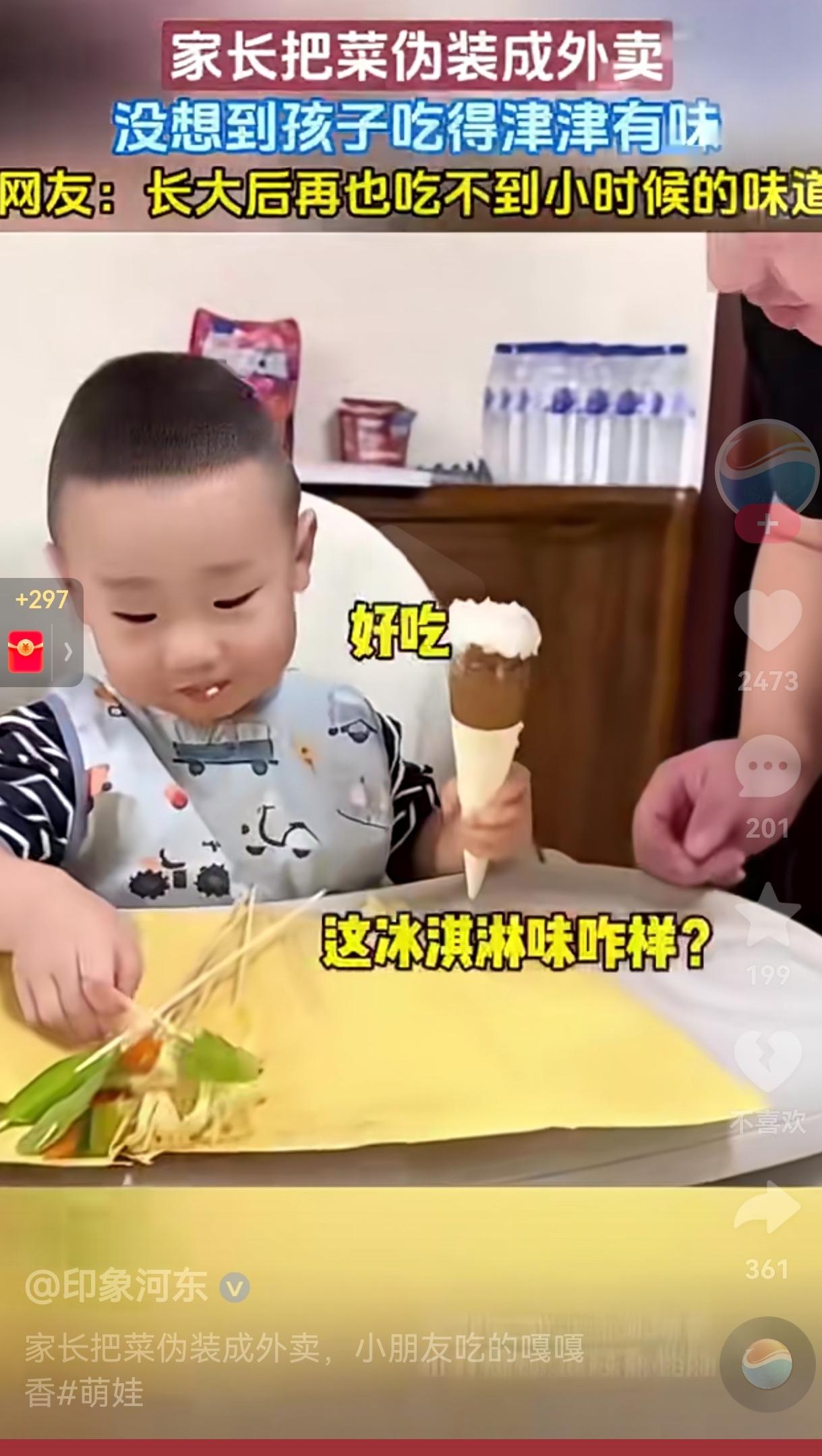 笑不活了!小孩不喜欢吃饭,就喜欢吃外面的外卖,为了让娃好好吃饭,老父亲竟把亲手做的菜装进外卖袋、串成烤串的样子,就连冰淇淋也是用米饭装的,然后再用外卖盒子一装,这样一来就把自己做的饭,成功伪装成了外卖。 为了使萌娃彻底相信,这就是外卖,爸爸把戏份演足,只见他先是走到门口手动按响门铃,装作外卖员喊他取外卖的样子。 接着把装在黄色外卖纸袋里的“烤串”、裹着冰淇淋包装的自制甜品摆到宝宝的餐椅上,让宝宝品尝宝宝信以为真,就真的品尝了,当孩子吃到第一口外卖时,爸爸还笑着问孩子“这冰淇淋味道咋样?”。 孩子的反应也很真实,先是盯着这些“外卖”直咽口水,接着就抓起串着蔬菜的签子就往嘴里塞,咬下一大口后,又拿起“冰淇淋”咬了一大口,小嘴巴嚼得不亦乐乎,甚至还回答道:“好吃啊?” 看到孩子吃的这么开心,爸爸妈妈在一旁乐开了花。 网友看到后评论说:“我家娃也挑食,为了让他吃口青菜,我还把菜切成小动物形状。” 也有的网友说:“等孩子长大了,或许会忘了外卖的味道,但一定会记得爸妈为了让他吃饭花的心思。” 还有的网友调侃说:“但凡有个幼儿园毕业证,也不至于被爸妈耍的团团转呀!” 笑归笑,其实这件事,越想越有懂得父母的良苦用心! 为什么父母会这么做呢?说白了还是为了孩子着想,父母也不是舍不得给孩子点外卖,他们也知道外卖肯定比家常便饭好吃,可是,孩子还小,身体正在发育的关键期,吃外卖对身体不好。 所以,父母才会想着法的,为孩子这么做。 虽然,孩子现在傻傻分不清,可是等有一天,孩子真的长大了,能分清“外卖”和“家常菜”了,想必他肯定也不会怨恨父母,只会理解父母的良苦用心吧!