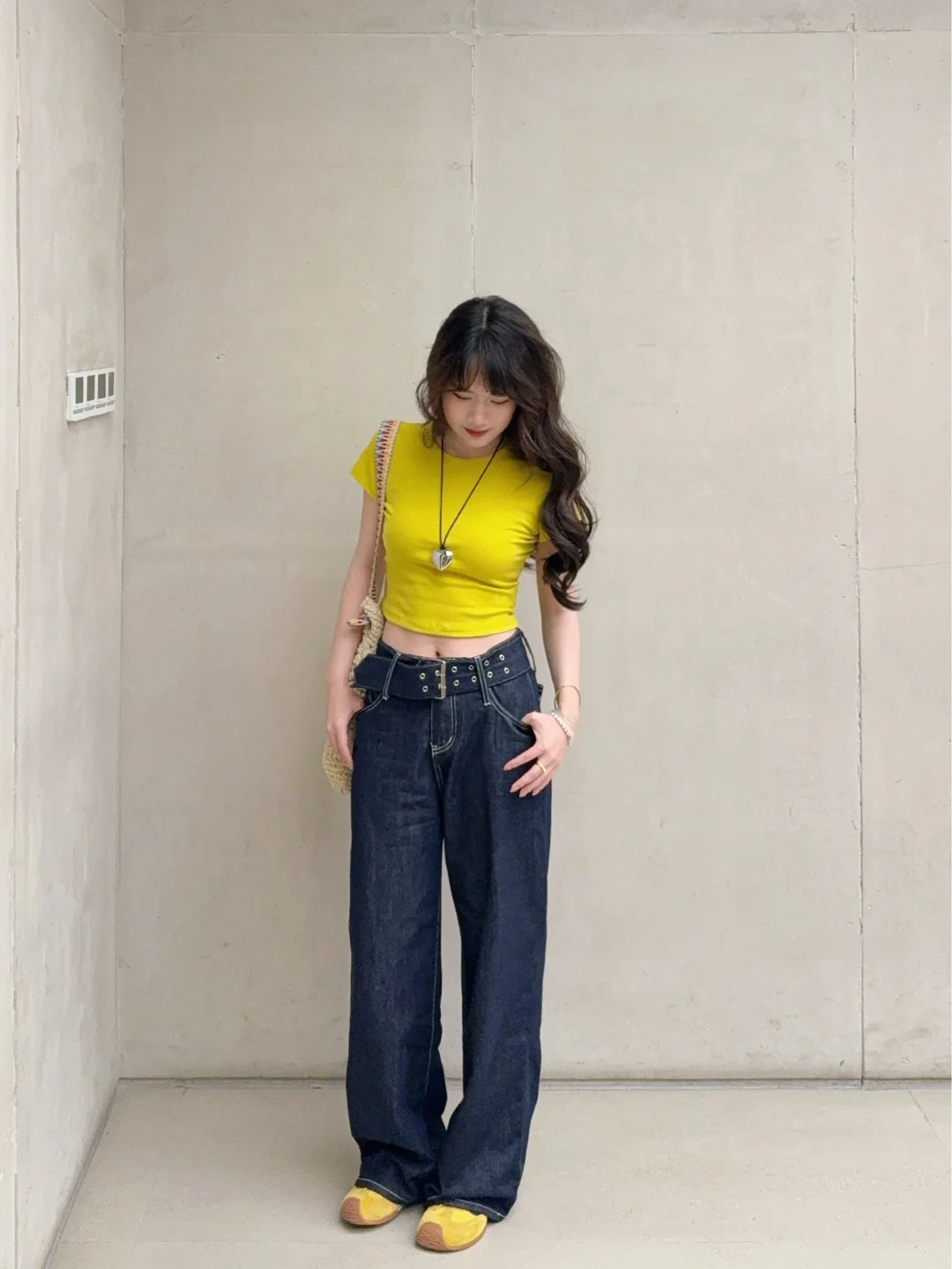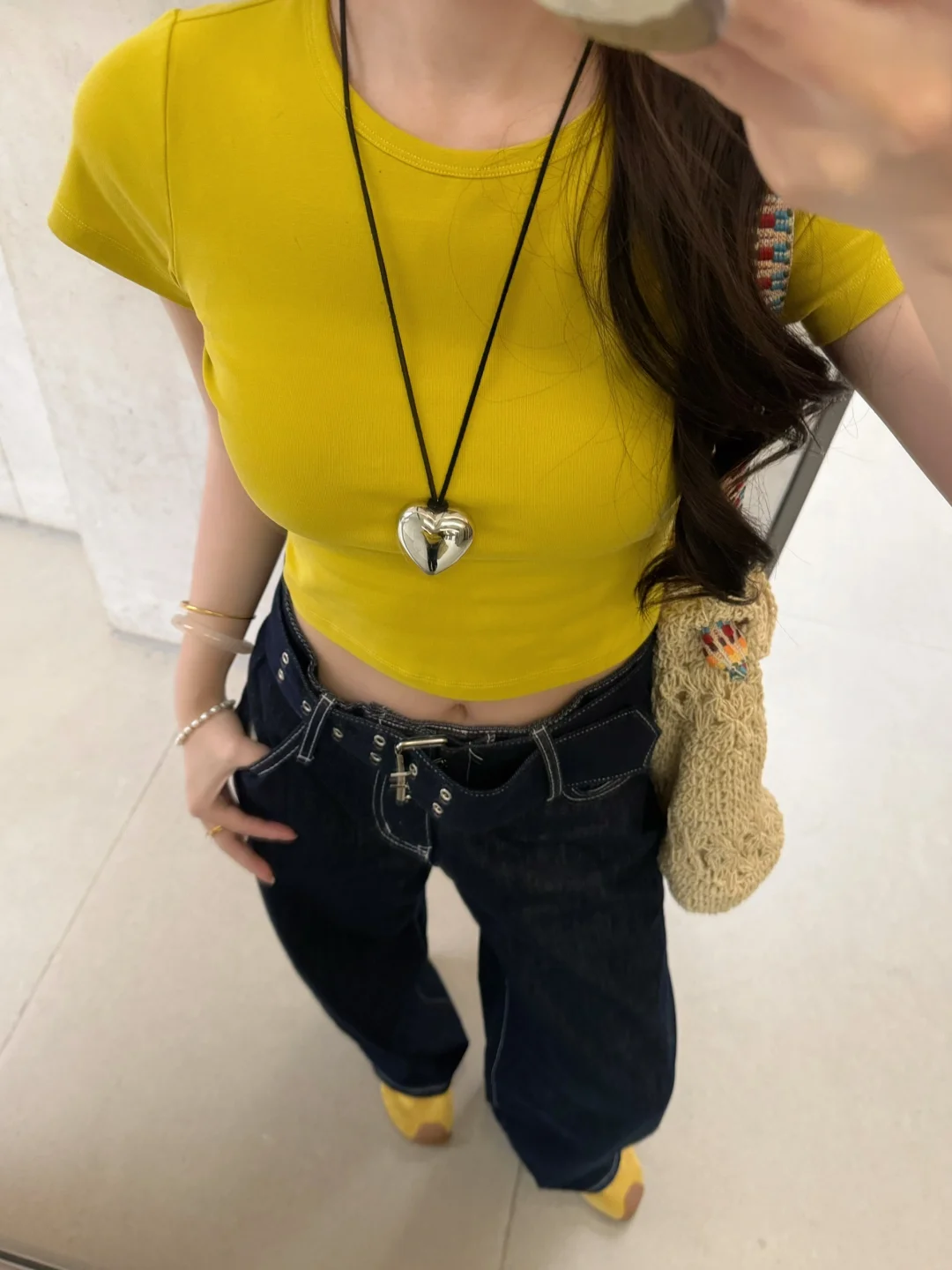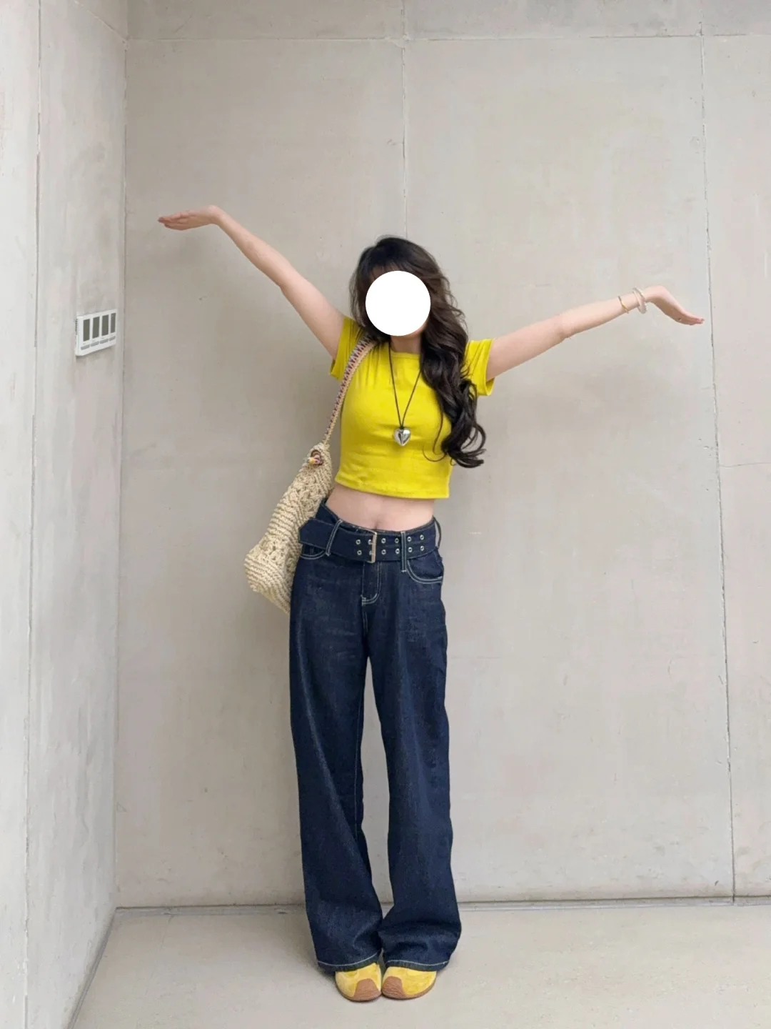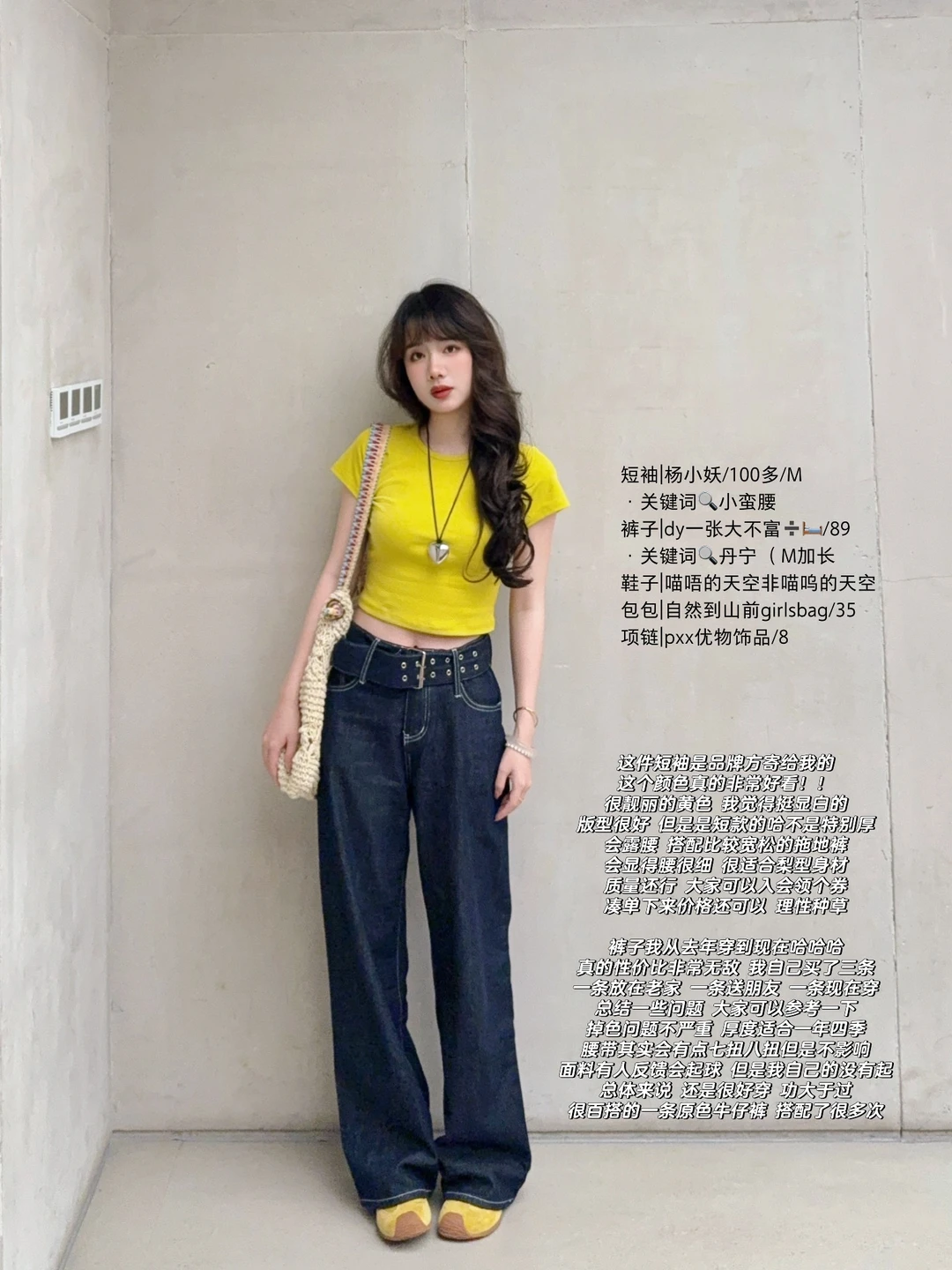 168/107 日常舒适好穿 上短下长特别适合梨型身材 这个黄色很显白也比较特别 已爱上!! 正肩短袖➕宽松拖地裤真的挺显身材的 裤子确实出现频率过高了 当之无愧包浆裤 (有时候真的不想搭哈哈哈感觉穿太多次了 ) 但是入股不亏 一年四季都可以穿~ 搭配正肩短袖宽松短袖和衬衫都是可以的 也可以直接搭配小吊带 秋冬也可以搭配卫衣夹克