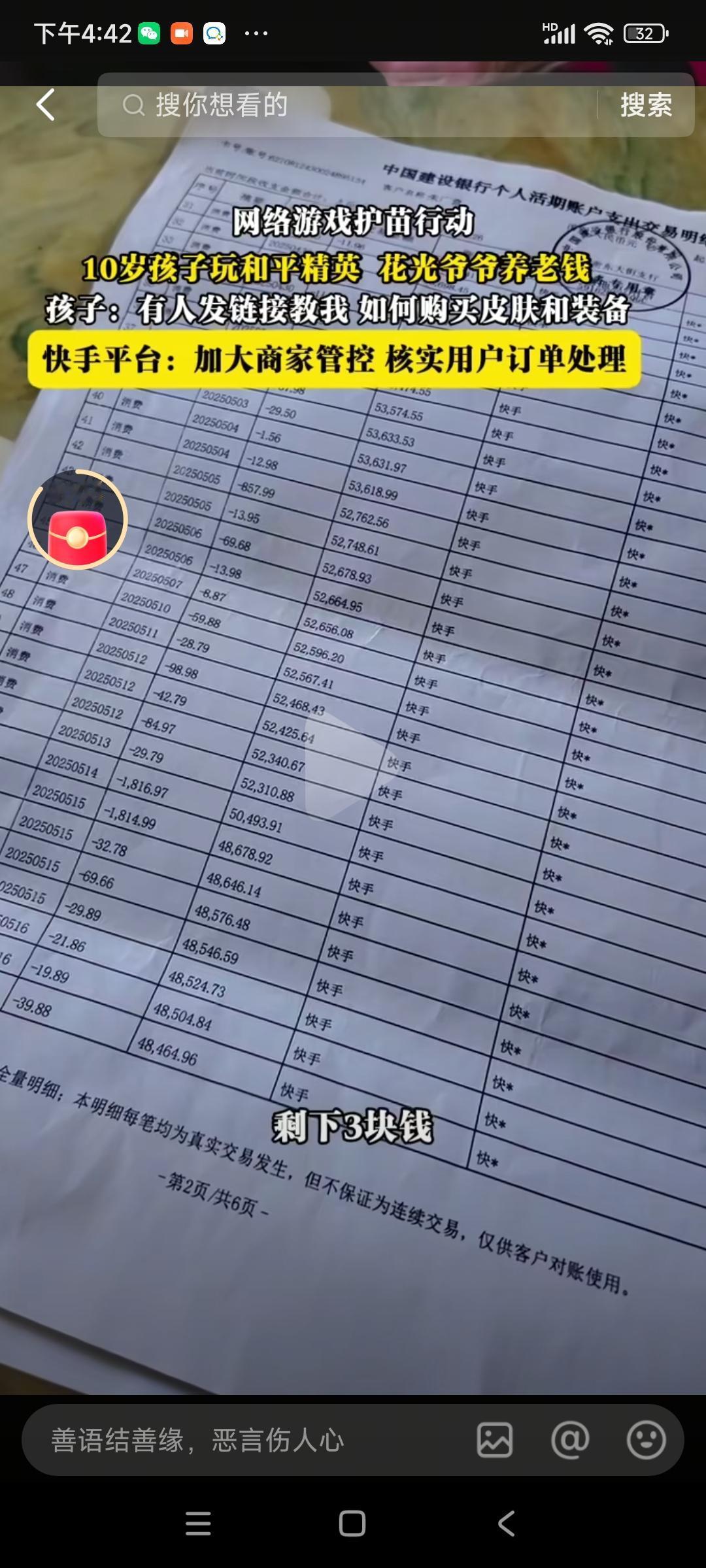 担心的事情还是发生了!河南新密,一名环卫工爷爷,和老伴攒了一辈子钱,一共攒了6万,万万没想到,去银行一查,只剩3块钱,老两口气的发抖,孩子奶奶直接晕倒。 原来10岁的孙子,迷上了一款游戏,通过链接学会了如何购买装备,在短短五个月时间竟然把老两口十年的积蓄花的只剩三块钱! 河南新密的银行大厅里,一幕揪心的场景让周围人都忍不住红了眼。年过六旬的环卫工爷爷牵着老伴的手,颤巍巍地递上存折,想取点钱给老伴买些营养品,可当工作人员报出账户余额时,老两口瞬间傻了眼。 原本存着6万养老钱的账户,只剩下3块钱。这个数字像晴天霹雳砸下来,爷爷当场气得浑身发抖,老伴更是没忍住,眼前一黑直接晕倒在地,被众人紧急掐人中救醒。 谁也没想到,把老两口一辈子积蓄“清空”的,竟然是他们10岁的孙子。老两口就靠爷爷当环卫工的微薄工资过活,每天天不亮爷爷就穿着橙色工装穿梭在街头,刮风下雨都不耽误,老伴则在家附近打些零工补贴家用。 这6万块钱,是他们省吃俭用十年攒下的血汗钱,一分一厘都浸透着辛苦,原本是打算留着养老,万一身体出点状况也能应急,可如今却一夜之间几乎归零。 老两口怎么也想不通,存折一直好好放在家里,密码只有他们两人知道,钱怎么会不翼而飞。在银行工作人员的帮助下,他们打印出了详细的交易流水,密密麻麻的消费记录让两人越看越心惊。 这些交易大多是小额高频的支出,集中在近五个月内,每笔从几十块到几百块不等,收款方全是各类游戏相关的平台。 直到这时,他们才猛然想起,孙子最近总是抱着手机不放,吃饭、睡觉都舍不得撒手,原来是迷上了一款游戏。 追问之下,孙子才支支吾吾地说出了实情,他把自己小天才电话手表中的卡插到了爷爷不用的旧手机中,原来他在玩游戏的过程中,弹出了购买装备的链接在链接里学会了充值。 孩子根本没有金钱概念,也不知道这些钱是爷爷奶奶起早贪黑攒下的养老钱,只觉得充值后能在游戏里变得更厉害,短短五个月时间,就把6万块钱花得只剩最后3块。 看着孙子稚嫩的脸庞,老两口既生气又心疼,却根本狠不下心责备。他们平时忙着赚钱养家,对孙子的陪伴和管教都有些疏忽,更不懂什么网络防沉迷知识,连手机支付的风险都没放在心上,才给了孩子可乘之机。 事发后,老两口在亲戚的帮助下联系了游戏平台,希望能追回部分钱款。他们翻找出所有的交易记录和支付凭证,一点点整理好提交给平台,焦急地等待着处理结果。 对于这个本就不富裕的家庭来说,这6万块钱不仅是养老的保障,更是对未来生活的期许。而孩子之所以会做出这样的事,一方面是因为年龄小、认知不成熟,难以分辨网络消费的风险,另一方面也和家庭监护的缺失有着分不开的关系。 随着智能手机的普及,未成年人接触网络的机会越来越多,如何守护好家庭的“钱袋子”,引导孩子正确使用网络,成了很多家长需要面对的难题。 这对环卫工老两口的遭遇,也给更多家庭敲响了警钟。平时多花点时间陪伴孩子,加强对孩子的网络素养教育,妥善保管好手机和支付密码,关闭不必要的小额免密支付功能,才能从源头减少这类意外的发生。 对此,你们有什么看法,欢迎评论留言~