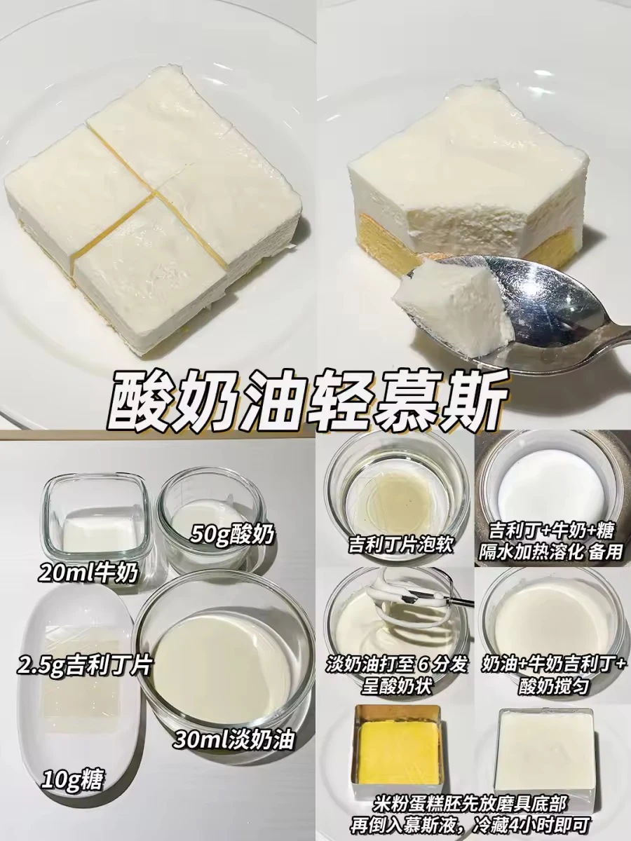 ��酸奶油轻慕斯:20ml牛奶,50g酸奶,2.5g吉利丁片,30ml淡奶油,10g糖