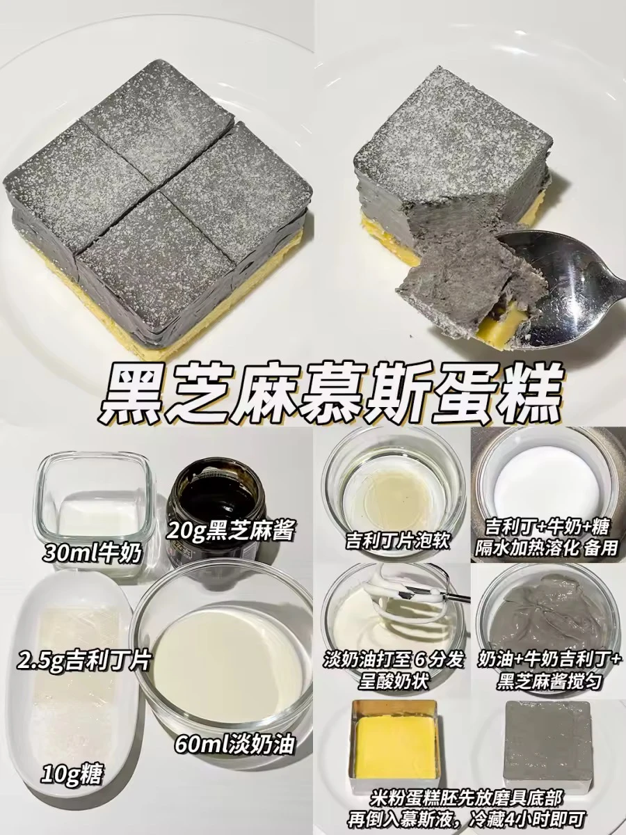 ��黑芝麻慕斯蛋糕:30ml牛奶,20g黑芝麻酱,2.5g吉利丁片,60ml淡奶油,10g糖