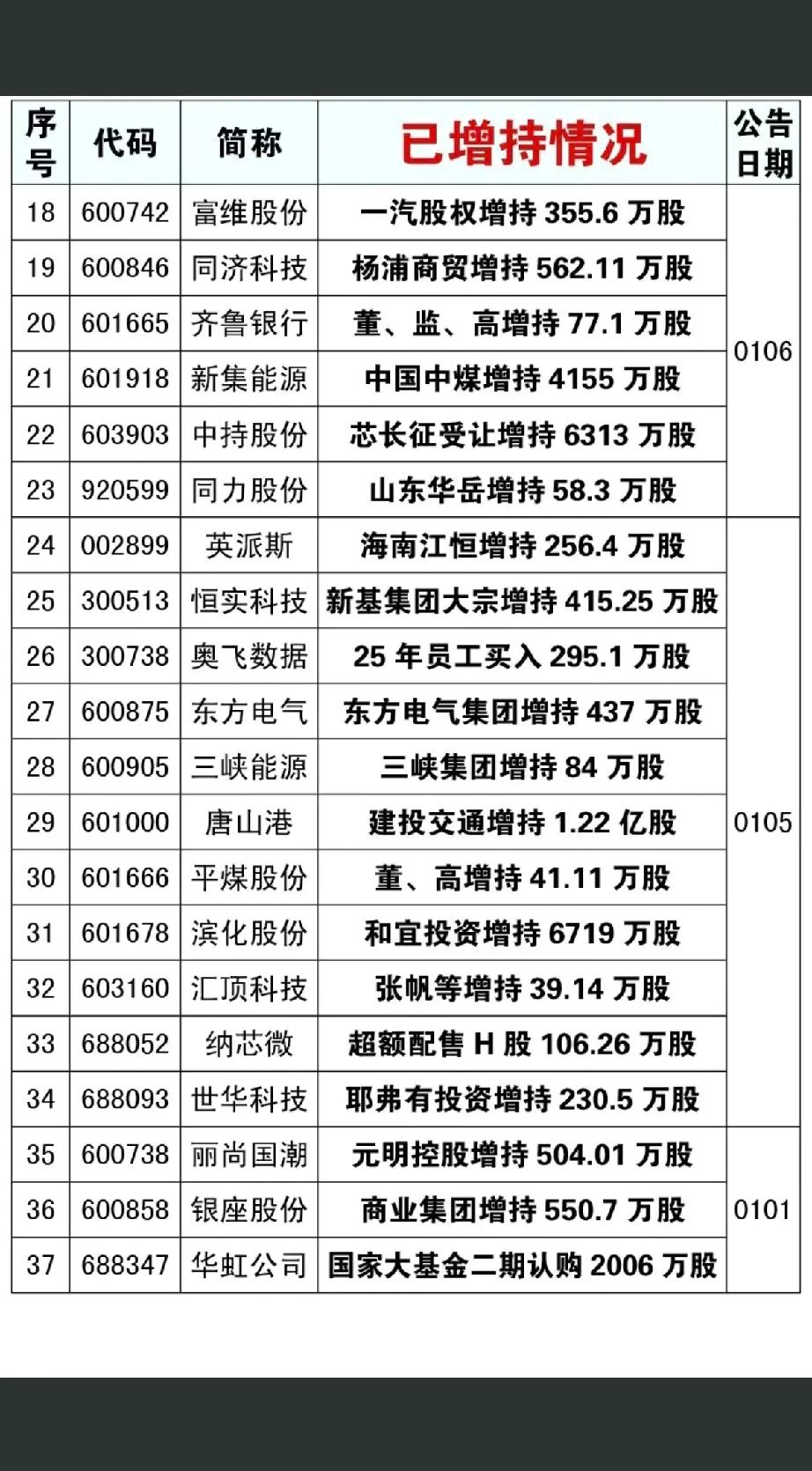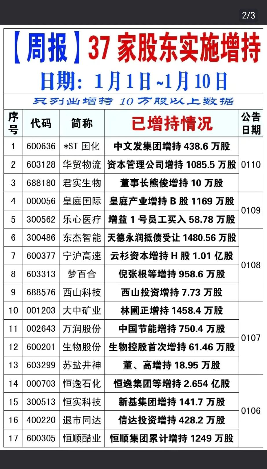 1月11日周日,下周A股这些股票值得重点关注!!! 本周,9家公司披露增持计划,重点关注:机构拟询受南网科技847.1万股,后市值得高看一眼;37家股东实施增持,重点关注:皇庭产业增持皇庭国际1169万股,后市值得期待!!!