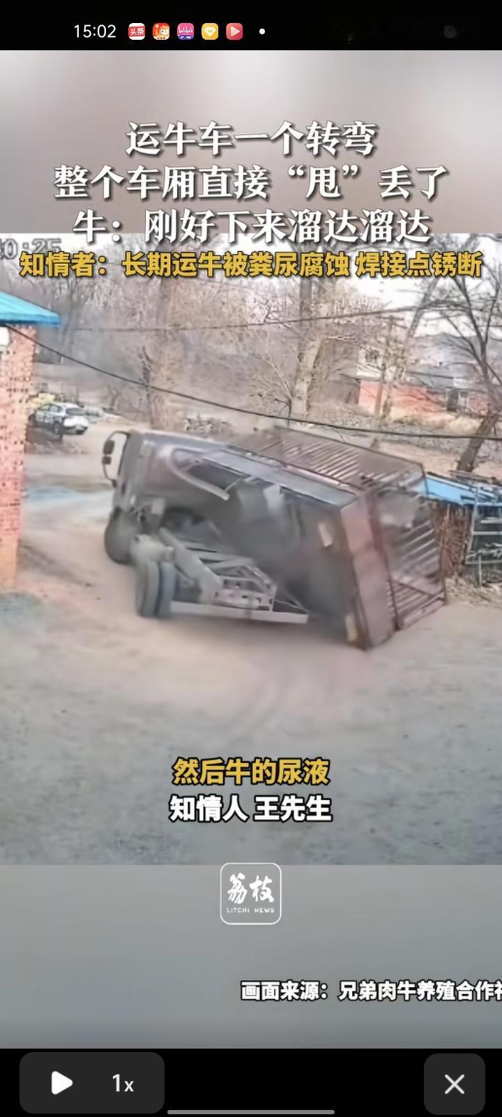 1月7日,四平市伊通县。运牛车一个转弯,整个车厢的牛直接“甩”丢了。有知情人称,主要是车常年拉牛,牛的尿液腐蚀性比较大,司机没有检查,焊点就开了,好在牛没丢