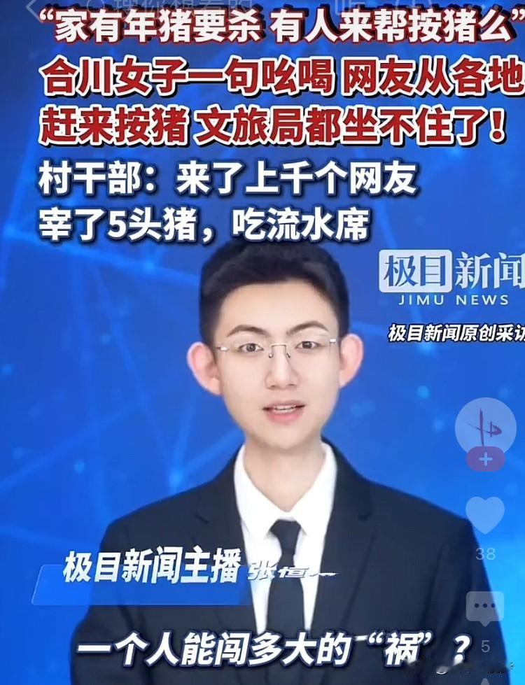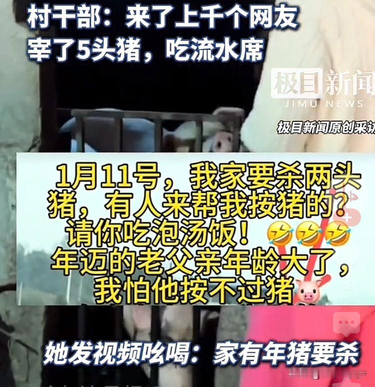 1月11日,重庆合川一名女子发布视频喊话,称自家要杀两头年猪,因担心年迈父亲无力按住猪,公开招募网友前来帮忙,还承诺管吃泡汤饭。她打趣表示,不求别的,就想家门口停满车,场面比结婚还热闹,在村里“扬眉吐气”一回。 这条接地气的吆喝视频迅速走红,不仅吸引超10万人在线围观,更有上千名网友从各地驱车赶来赴约。为了招待远道而来的客人,当地最终宰杀了5头猪,摆起流水席,场面十分热闹。 事件热度居高不下,连合川文旅局也主动关注跟进。极目新闻等多家媒体对此事进行了原创采访报道,相关话题引发网友热议,“合川呆呆”抖音号也随之成为相关搜索热词。