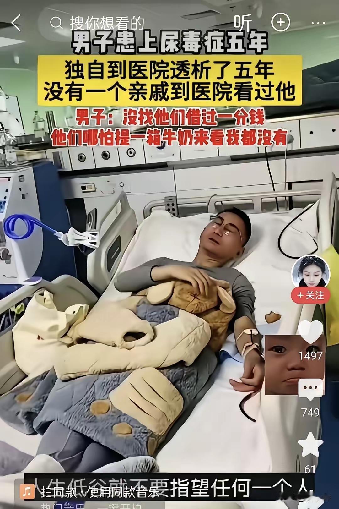 男子患上尿毒症五年 独自到医院透析了五年 没有一个亲戚到医院看过他 男子:没找他们借过一分钱 他们哪怕提气箱牛奶来看我都没有 五句话,每一句都像一把锤子敲打着胸膛让人心疼! 十级孤独,你能承受几级? 一级孤独:一个人逛街 二级孤独:一个人搬家 三级孤独:一个人去旅游 四级孤独:一个人吃火锅 五级孤独:一个人下棋 六级孤独:一个人看电影 七级孤独:一个人看海 八级孤独:一个人看病 九级孤独:一个人过春节 十级孤独:一个人做手术 人情交往都是礼尚往来,平时没有很深的交集,不要以为是亲戚,就会有所改变。他平常走动亲戚吗?过年过节拜访过人家吗?拿这个绑架亲戚有点不地道哈。 网友表示:我父亲透析二十多年,一周三次,一次四个小时,都是一个人去。去医院跟上班一样,半天就回家了,要亲戚去医院看你?逢年过节上门看看你还不行?刚病时亲属会看你,这透析是长期的,后来没人去也正常。两方面,一方面亲戚人品有问题,一方面他自己人品有问题。 广西的朋友:我也是尿毒症五年了,得了病以后基本上就是社会边缘人了,别说亲戚了,父母都不会过问你的病情,目前比别的病友好一点的是老婆还没跑,主要还是想给孩子一个完整的家庭吧,尿毒症患者就不要奢求什么人间温暖了,守好自己的家就不错了。 山东的朋友:十级孤独的我!2010年做手术,虽然是微创,自己发现肚子怎么硬,老公说便秘吧,自己去医院检查,子宫肌瘤,太大了,立马住院手术,当时还是自己签字!后来老公回来还开玩笑说我真厉害 广东的朋友:花甲之年的本人是十级,没问题,本人习惯了……老伴走了十多年了,苦辣酸都经历了,无所谓了 。 上海的朋友:一个人过中秋,过年30,过端午巳经超过十年了,该咋就咋,活得好好!也吃鸡也买虾也喝酒,节日气氛一样没少,吃完跑跑步运动,看电视,又在朋友圈发个祝福,简单很多很好! 孤独不代表寂寞、可怜、没人爱,孤独是一种能力,那些独自走过的路,终将赋予你拥抱世界的力量。