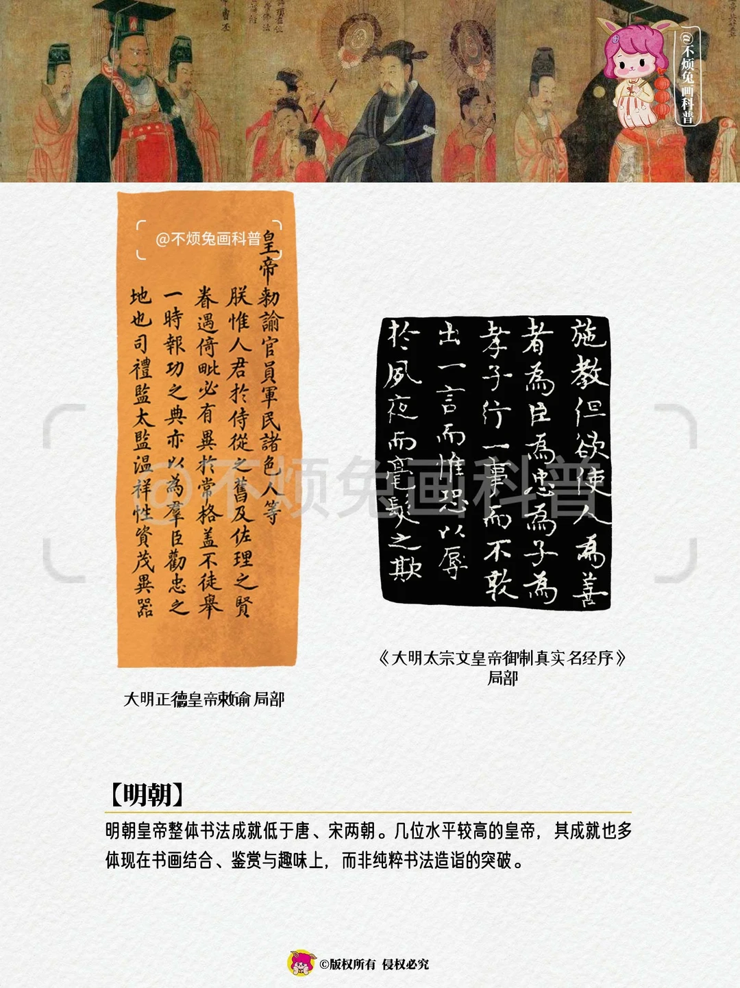 明朝皇帝整体书法成就低于唐、宋两朝。几位水平较高的皇帝,其成就也多体现在书画结合、鉴赏与趣味上,而非纯粹书法造诣的突破。