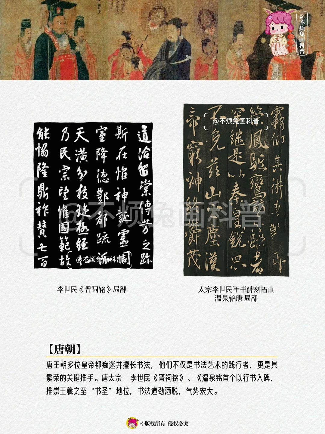 唐王朝多位皇帝都痴迷并擅长书法,他们不仅是书法艺术的践行者,更是其繁荣的关键推手。唐太宗 李世民《晋祠铭》、《温泉铭首个以行书入碑,推崇王羲之至“书圣”地位,书法遒劲洒脱,气势宏大。