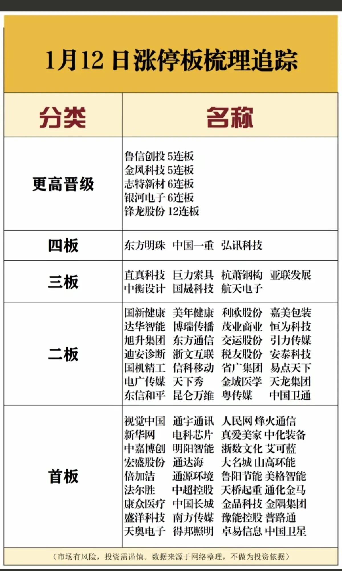 1月12号,周一A股涨停梯队一览表!! A股今日成交量创历史天量,17连阳也是牛气哄哄,今日锋龙股份成功12连板,打开市场新高度,后市值得期待;志特新材今日6连板,当前市场最牛股,20cm六连板不多见,后市值得高看一眼!!!