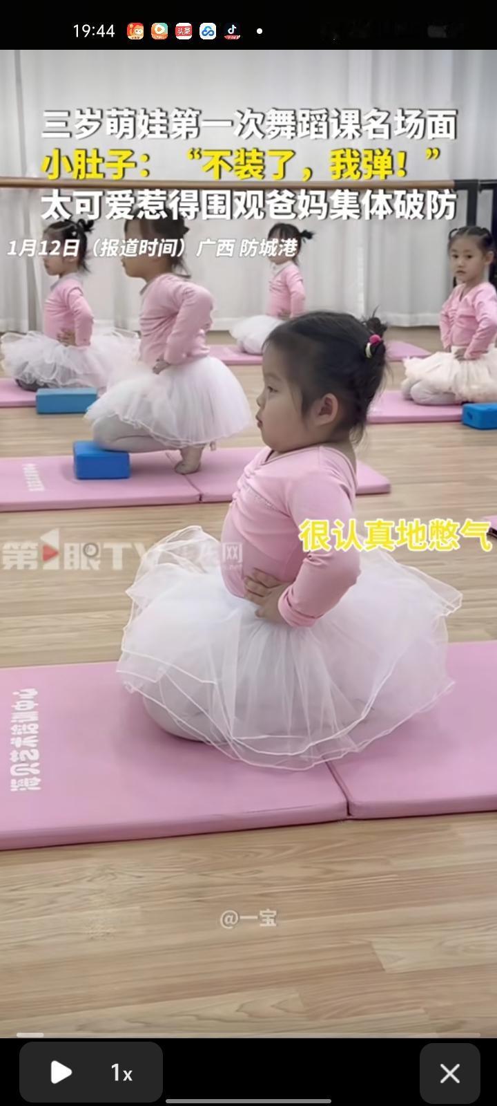 1月8日,广西防城港。孩子妈妈晒出三岁女儿第一次舞蹈课的名场面,她一直吵着说要去跳舞减肥。上课时,老师说要练习体态,叫挺胸收腹,可以说,她做起来真的很认真,在外面看的家长集体破防。