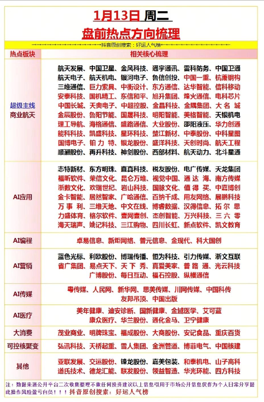 1月13日,周二A股盘前热点方向梳理!!! 商业航天板块:重点关注:杭萧钢构、巨力索具、铂力特;AI应用板块:重点关注:昆仑万维、三维天地、汉得信息;AI营销板块:重点关注:易点天下、天下秀、每日互动!!!