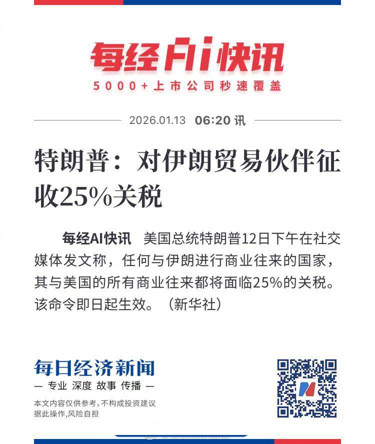 加税25%!特朗普宣布对伊朗实施新制裁! 1月12日下午,美国总统特朗普在社交媒体发文表示,任何与伊朗有商业往来的国家,其与美国的所有商业往来都将被征收25%的关税。 特朗普称,这是“最终”决定,且“立即生效”。 因美国长期对伊朗实施严厉制裁,美伊双方几乎没有商业往来和正式外交关系,美国无法借助关税手段直接对伊朗形成有效施压。所以,此次制裁实则也是针对与伊朗有贸易往来的国家,相当于给伊朗的贸易伙伴国加征了关税。显然,美国针对中俄的意图十分明显。 美国对伊朗实施制裁已长达数十年。目前来看,虽制裁对伊朗经济和民生造成了显著冲击,但美国试图通过制裁实现伊朗“政权更迭”等核心目标并未达成。 尽管实施了制裁,特朗普仍认为外交是“首选”方案,但他表示,若有必要,“会毫不犹豫地动用美国军队”。 可见,美国双管齐下、多路推进,试图一举拿下伊朗。不过,近期伊朗国内局势渐趋稳定,此次突然制裁或许是特朗普一时恼羞成怒之举。
