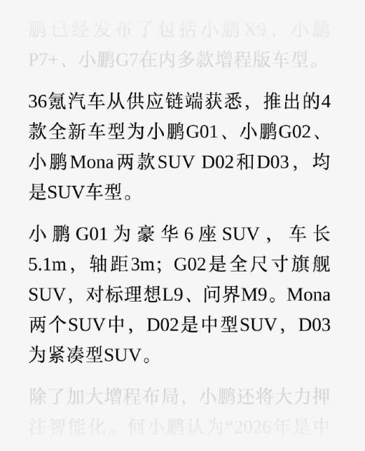 据36氪汽车消息,小鹏2026年的销量目标定为55万-60万辆(2025年实际交付42.94万辆),这意味着月均交付需达到4.58万-5万辆。 要完成这一目标当然需要爆款支撑,爆料称小鹏计划推出4款全新SUV(纯电+增程): 小鹏G01:豪华6座SUV,车长5.1米,轴距3米,定位高端家用市场; 小鹏G02:全尺寸旗舰SUV,对标理想L9、问界M9,车长超5.3米; Mona系列两款SUV:D02(中型SUV)、D03(紧凑型SUV),主打15万-25万元性价比市场。 上述新车与现有车型(如X9、P7+、G7)形成覆盖主流价格区间的SUV产品线。 新势力中已经制定销量目标的有:零跑100万辆、小米55万辆,这两家今年也有不少新车要上。 大家觉得都能完成销量目标吗?【来自懂车帝车友圈】