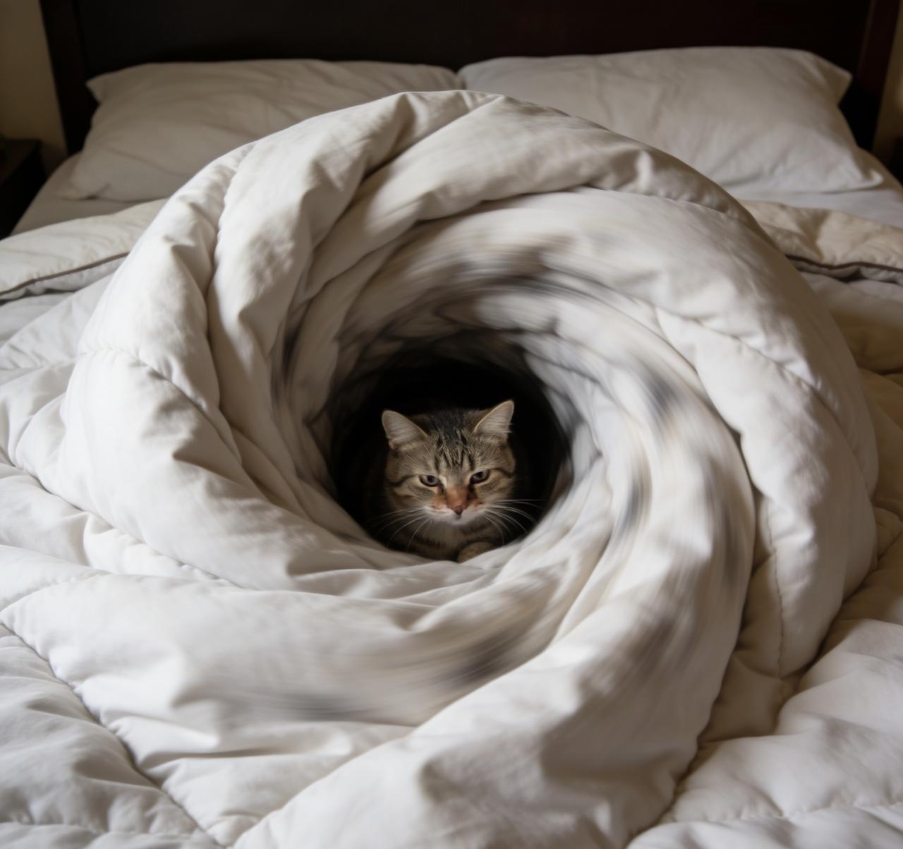 所有小猫钻被窝,都逃不过这5个标准步骤 第一步:被窝外侦查 蹲在枕头边暗中观察,耳朵转成雷达,胡须测量缝隙宽度,眼睛眯成一条缝——此刻它不是猫,是执行潜入任务的特工。 第二步:爪子试探 伸出前爪轻拍被面,像在敲门。若人类无反应,立刻用肉垫按压试探温度,整套动作轻盈如拆弹专家。 第三步:旋转开洞 找到最佳入口后,突然开始原地转圈,仿佛在跳某种神秘仪式舞蹈。其实是在用体重压出“猫形隧道”。 第四步:倒车入库 80%的猫选择屁股先进,倒退着挤进被窝。留脑袋在外继续监视,确认安全后“噗通”一声全身消失。 第五步:深夜惊喜包 当你半夜翻身,突然踩到一团毛茸茸的“暖水袋”——别怕,那是成功潜入的猫正在被窝正中心发出咕噜捷报。 养猫人才懂的真相: 所谓“钻被窝统一流程”,本质是猫用30秒完成“宣布领土主权”的仪式。你的被窝?早就是它的行宫了! 你家主子的钻被窝必杀技是什么 欢迎晒图讨论!👇