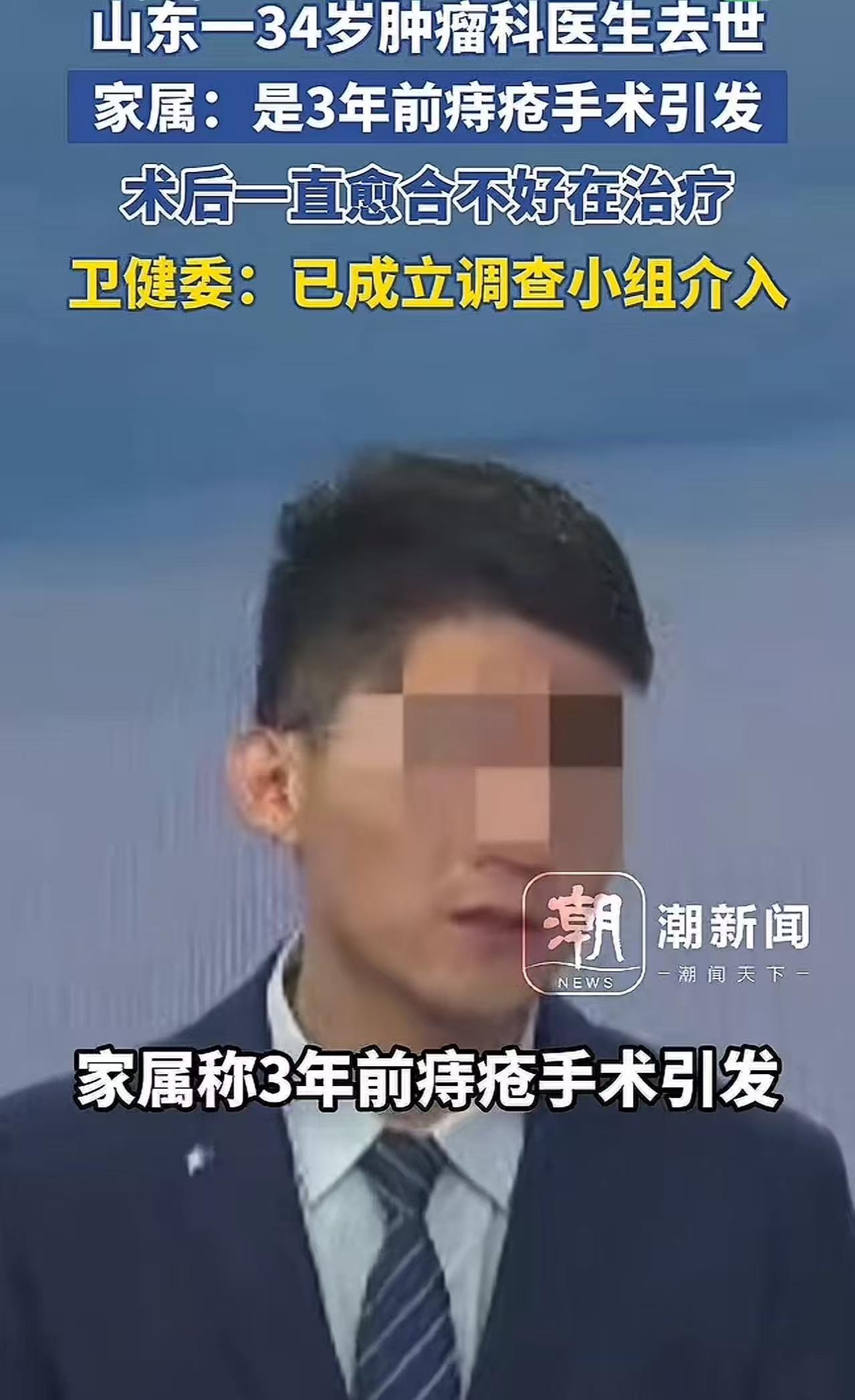 山东,一34岁肿瘤科医生去世,家属称是3年前在本院做的痔疮手术引发,术后一直愈合