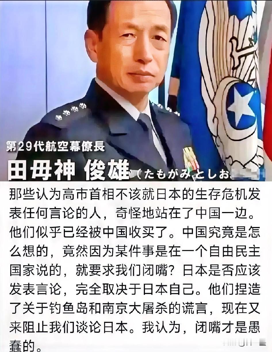 高市早苗怕是睡不着了, 日本极右翼:高市首相没错,没人替日本说话,就因为他们都被中国收买了。 田母神俊雄在社交平台上卖惨,说日本是自由民主国家,我们不会闭嘴,高市早苗首相发表什么言论,那是日本的自由,别国家无权干涉。 如今那些认为不该发此言论,出奇都站中国那边,肯定是被中国收买了,中国竟然还想让我们闭嘴。 胡说八道,按照他的思维,我们就可以说小日本是中国的固有领士,反正言语自由了。 高市早苗口出狂言,挑衅中国底线,扭曲历史事件,捏造钓鱼岛与南京大屠杀的谎言,美化珍珠港事件等等。 如今前自卫队高官出来煽动言论,制造对立,可是高市早苗发表“生存危机”预谋已久,是日本极右翼政客势力所为。 对于,日本的那些骚操作,中国直接采取行动,直接限制了出口日本的稀土,只能民用,去日本军事化。 打蛇打七寸,高市早苗直接喊:不符合国际法,我们不能接受。 针对这些死硬分子,继续往死里整,不见南墙不会回头。
