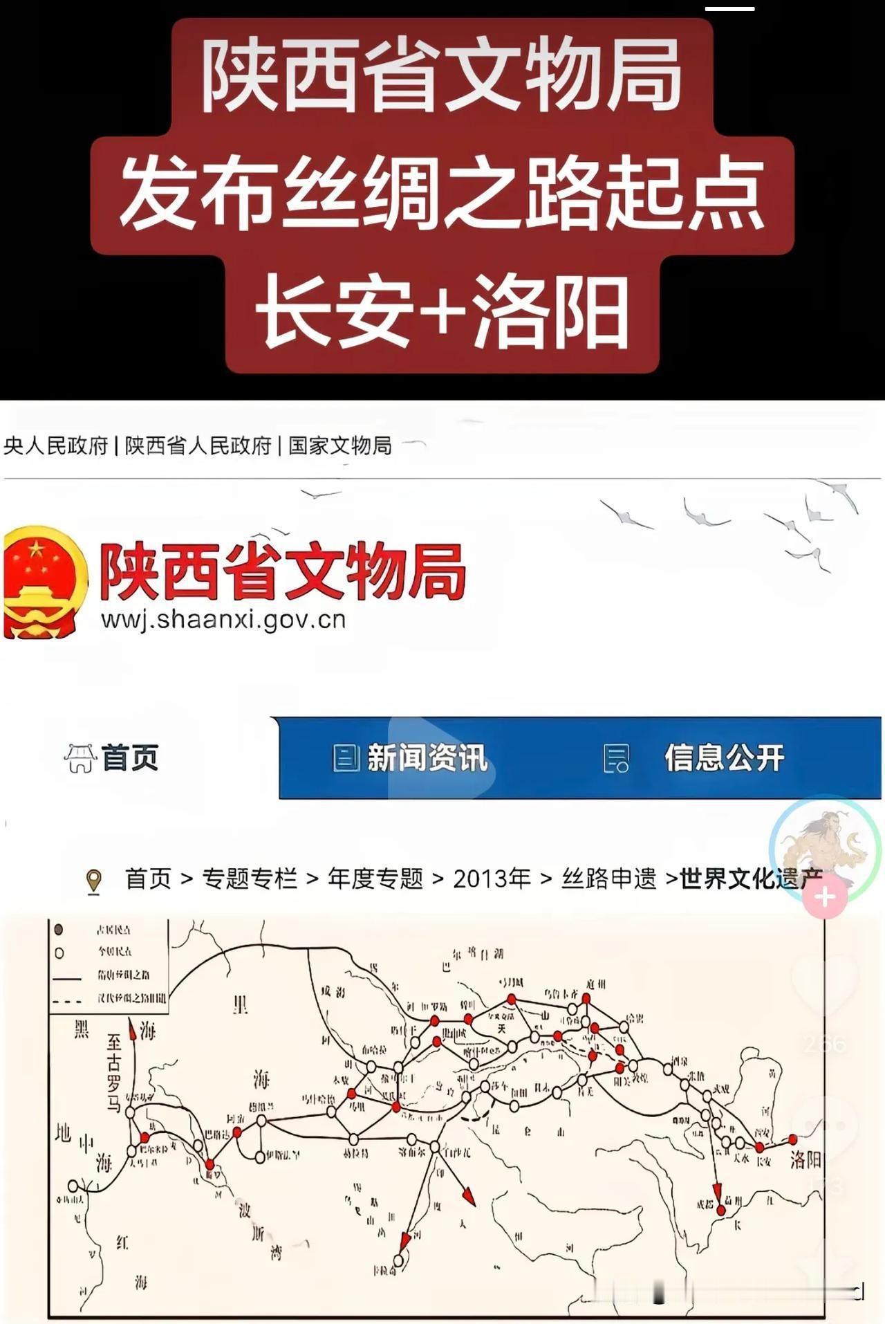 洛阳网友常常用教科文组织官网, 一段丝绸之路的起源介绍, 来证明洛阳也是起点之一。 其次是拿陕西省文物局官网的图, 来说明丝绸之路的起点是洛阳。 现在就揭露这种断章取义, 偷换概念抢起点或者双起点。 一、 Chang’an/Luoyang 是长安/洛阳,能说明是起点吗? from Chang’an/Luoyang 从长安/洛阳。 似乎不约而同的联想到出发。 这就是典型的断章取义,偷换概念。 全句是: “stretching from Chang’an/Luoyang”。 翻译成从长安或洛阳出发。 stretching是出发吗? 它是延续,伸延伸! 整句是从长安延续延伸的洛阳, 是都城的转换,而非起点的表述。 二、陕西省文物局官网图, 看清楚,那不是丝绸之路起点的连线, 那是遗址点的连线。 遗址点的连线怎么就成了起点? 因为他它在西安的东边, 所以就是丝绸之路的东方起点。 不觉得偷梁换柱,混淆概念可笑吗? 看客,你把图例放大看看, 那个实心点是什么? 是:古遗址点,明白吗? 不是丝路的起点。 看看国家历史博物馆的丝绸之路图, 起点,长安。洛阳是什么? 重要节点,延伸段的枢纽。 洛阳网友, 以后别拿这两个问题争双起点和东方起点了。 他根本不是起点, 伪论证明的更是伪论, 不是数学上的负负得正哦