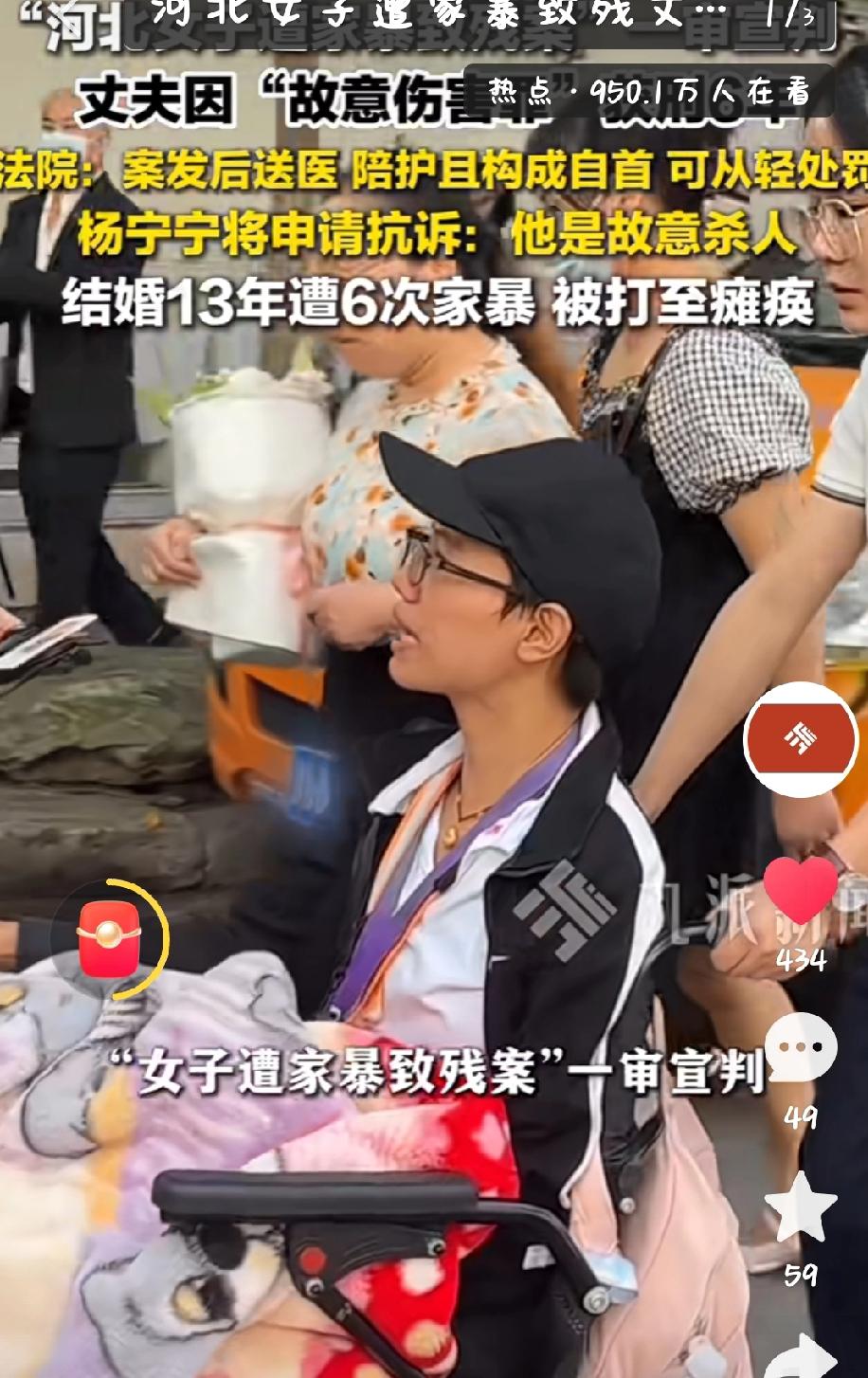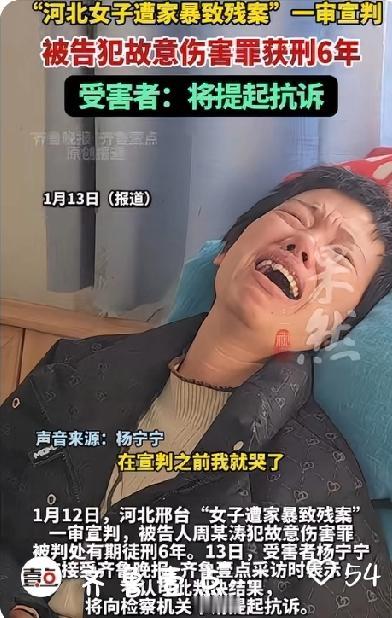 扇耳光,烟头烫到瘫痪,女子结婚13年遭家暴6次,丈夫被判刑6年! 2026年1月12日,河北邢台沙河市人民法院的一审判决,让持续四年的“女子遭家暴致残案”引发热议。被告人周某涛因犯故意伤害罪获刑六年,而受害者杨宁宁坐在轮椅上明确表示,将向检察机关申请抗诉,这场跨越数年的家暴悲剧,仍未画上句号。 时间回溯至2022年3月19日凌晨,熟睡中的杨宁宁遭到酒后丈夫周某涛的暴力袭击。周某涛三次掐住她的脖颈,最长一次达一分多钟,还将其头部猛撞床头柜。绝望中,杨宁宁以心口疼需服药为由才得以脱身,连夜逃往姐姐家。当日中午,她在诊所候诊时突发左侧肢体无力,最终被确诊为右侧颈内动脉夹层、缺血性脑梗死,落下五级伤残,终身瘫痪在轮椅上。 这并非孤立的暴力事件。2010年结婚后,杨宁宁在13年婚姻中遭遇6次家暴,从最初的扇耳光、烟头烫伤,到后来的暴力升级,周某涛每次施暴后都以哭跪道歉换取原谅,可每次又都是一次恶性循环。2019年,儿子曾试图阻拦家暴,竟被周某涛一脚踹开。 案发后,杨宁宁家人果断报警,2022年8月周某涛被行政拘留10日并罚款500元。随着伤情鉴定升级为重伤二级,2023年11月案件转为刑事立案,2025年11月3日一审开庭。庭审中,控辩双方就罪名产生分歧,杨宁宁及其律师认为周某涛构成故意杀人罪(未遂),辩方则主张过失致人重伤罪,最终法院以故意伤害罪定罪,考虑到周某涛有自首、送医陪护等情节,判处其有期徒刑六年。 从当初结婚时的甜蜜憧憬,到如今身心俱残的绝望境地,杨宁宁的遭遇令人痛心疾首。6年的刑期确实不能抚平受害者的伤痛,一辈子都要坐在轮椅上生活的痛也是不可估量的,她申请抗诉,是为了给自己一个真正的公道,也是为了让更多遭受家暴的女性看到希望。家暴不是家务事,也不可原谅!