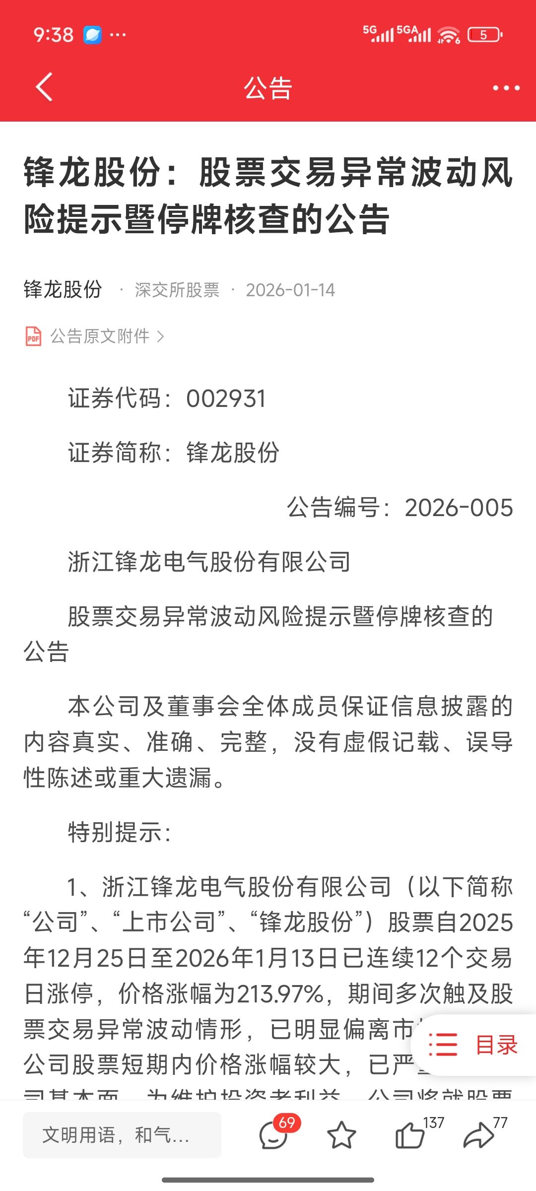 终于也被停牌了。当下市场的最高标锋龙股份,这只已连续13个一字涨停的股票,收盘后收到了停牌公告。其直接诱因是2025年12月24日的一则公告,优必选以16.65亿元通过“协议转让+要约收购”的方式拿下43.01%股权,实控人将变为周剑。自25日起,该股便开启连续一字涨停模式,13日封单超24亿元,换手率仅0.65%。 随着市场最高标的停牌,如今基本上所有高标股都已被停牌处理。市场对高标股的炒作热情或许会受到一定抑制。上层维护慢牛趋势的决心坚定不移,防止市场疯涨的意志坚如磐石。然而,部分游资、少数资金团体总爱顶风作案,妄图在一只股票上独占利益。 这种行为影响恶劣,必须对这些资金进行严格管控,如此才能实现共同富裕这一社会目标,才能让全体市场参与者、全体股民都能共享股市繁荣的胜利果实。 行业龙股 涨停龙 头 龙津股份 嵴锋龙 股票财经