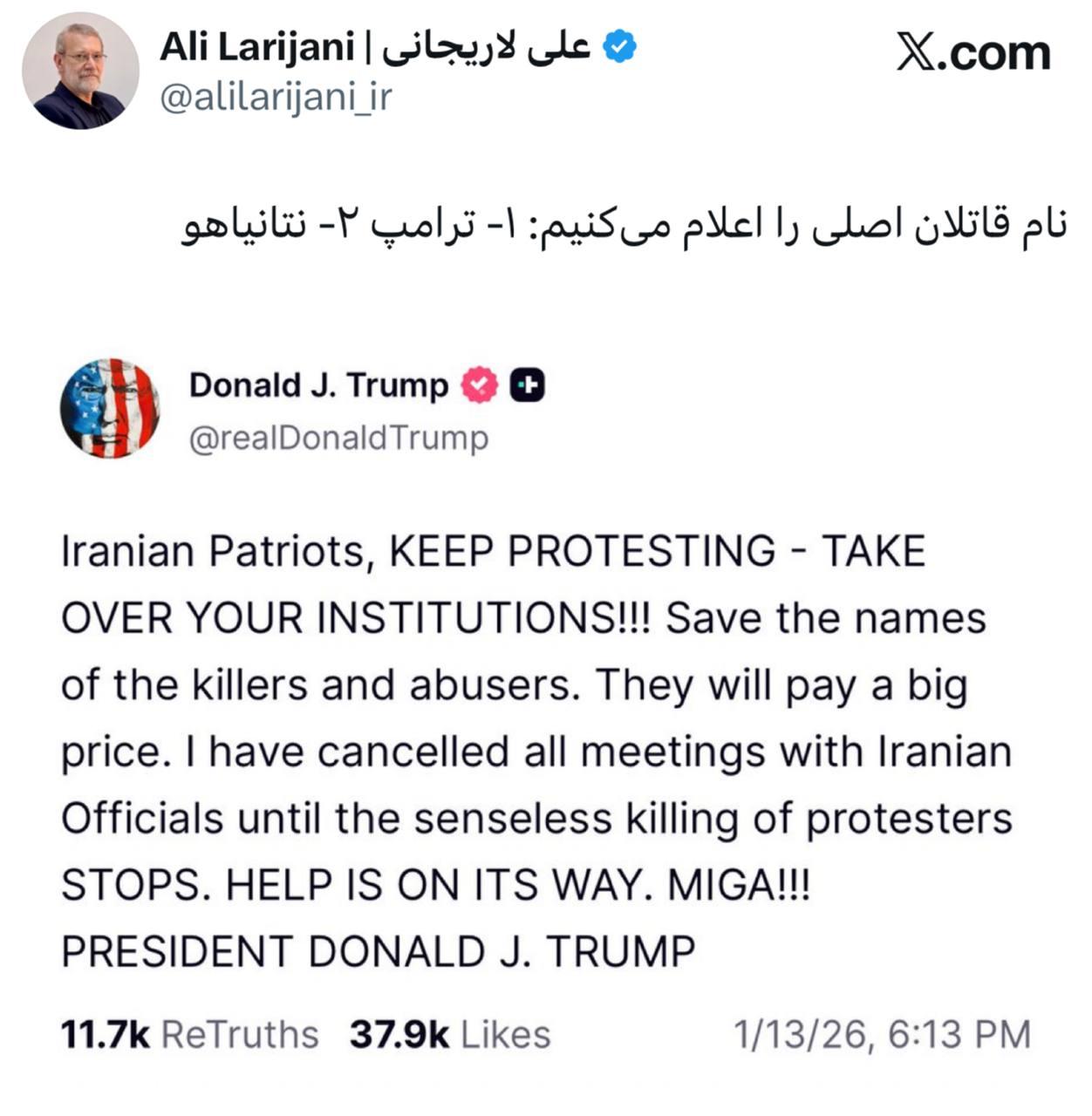 新闻快讯——伊朗国家安全委员会主席阿里·拉里贾尼,在回应特朗普“保存凶手和施暴者名单”的言论时表示:在此,我公布首要凶手的名单:1. 特朗普 2. 内塔尼亚胡。 拉里贾尼的推文直接将特朗普与内塔尼亚胡列为“主要凶手”,是伊朗官方对特朗普煽动伊朗抗议活动的强烈回击,延续了伊朗将国内动荡归咎于美以干涉的叙事。 特朗普推文 伊朗的爱国者们,继续抗议——接管你们的机构!!保存凶手和施暴者的名单。他们将付出沉重代价。在无意义杀害抗议者的行为停止前,我已取消所有与伊朗官员的会面。援助即将到来。加油!! 唐纳德·J·特朗普 总统