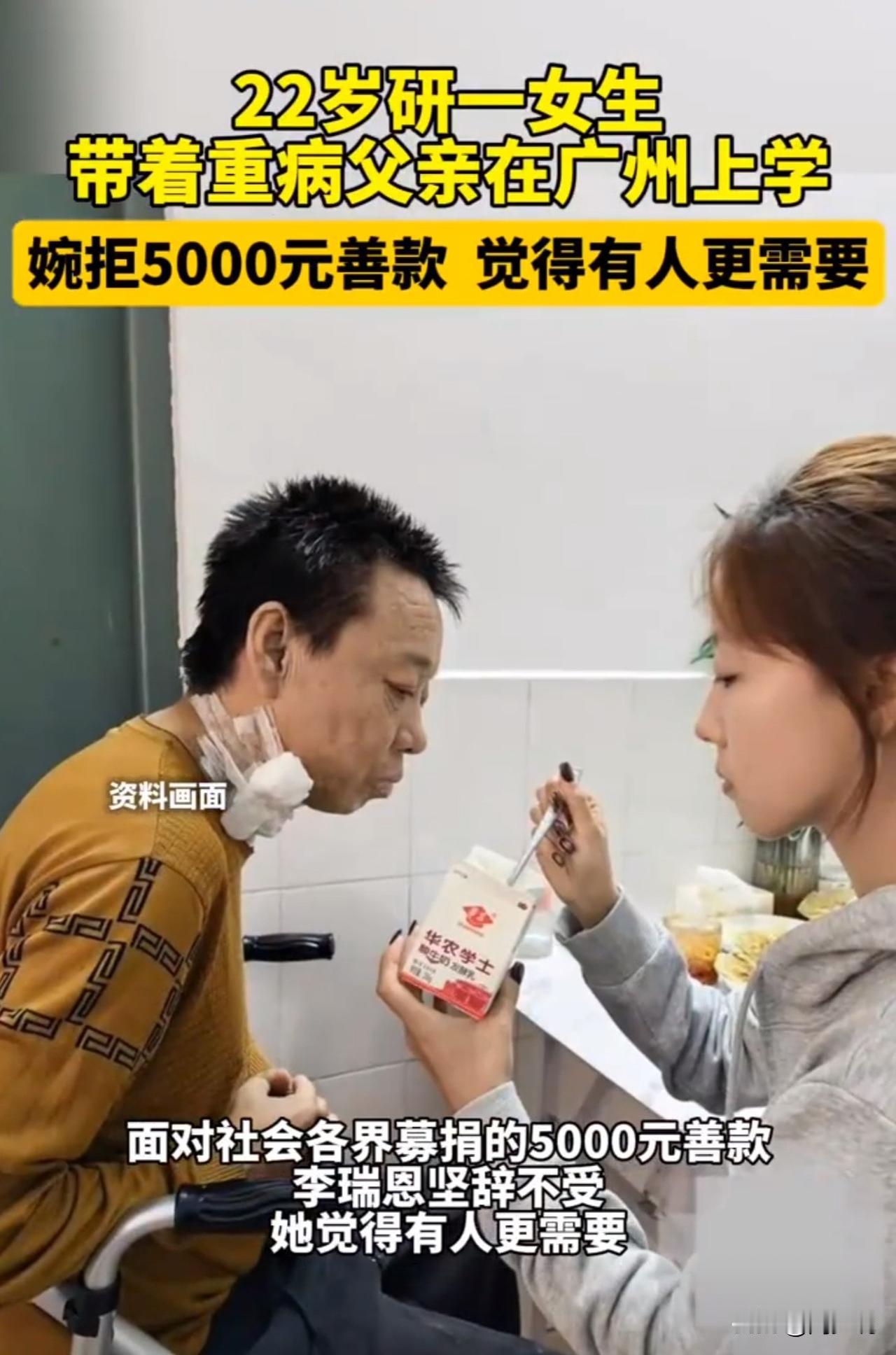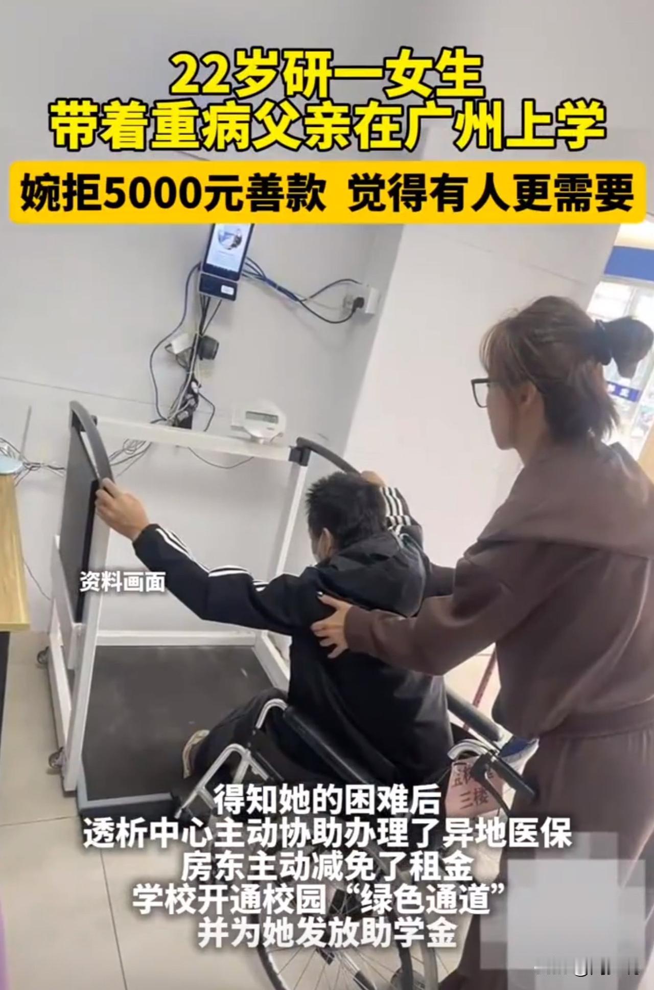 “全网称赞!”华南农业大学一位22岁女研究生火了,她过着“教室—医院”两点一线的特殊生活。一边是学业繁重,一边是贴身照顾身患尿毒症的父亲。得知她的困境后,透析中心帮办异地医保,房东主动减免租金,学校开通“绿色通道”发放助学金,还有爱心人士凑了5000元善款送到她手上。没想到,她却坚定推辞,觉得这笔钱有人更需要。 此事引发网友纷纷点赞:“懂事得让人心疼,这姑娘既有孝心又有骨气!” 更还有网友赞叹:“在最难的时候还想着别人,这格局太赞了!” 在周少看来,这位华南农业大学22岁女研究生的故事,是一堂生动的成长教育课。她用稚嫩的肩膀扛起家庭重担,没有被困境压垮,更没有在善意面前迷失本心。 这份在学业与孝道间的咬牙坚守,在取舍之间的清醒自持,比成绩单上的高分更耀眼。这才是年轻人该有的模样,有担当、知感恩、守底线,这样的孩子,未来必定可期。 社会的善意托举了她,而她的坚韧与善良,更给无数人上了一课:真正的优秀,从来不止于成绩,更在于刻在骨子里的责任与品格。#寻美三湘# #长沙新朋友#