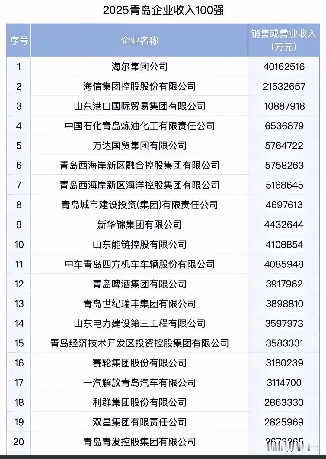 亮牌!青岛企业2025年营收排行榜前20名揭秘!济南都亮牌了,我们青岛企业一定要露一手!海尔、海信、山东港口三个千亿级巨无霸企业!快来围观揭秘详细内容!你觉得青岛企业还有哪些巨无霸?和济南相比较有哪些优势。[点亮平安灯][点亮平安灯][烟花][烟花] 欢迎关注@叮咚云 将优先为粉丝职业规划指导,1对1咨询是付费服务,为你定制最适合的就业择业方案!欢迎留言交流讨论。[来看我][来看我] 免责声明:图片来自网络,仅供参考!