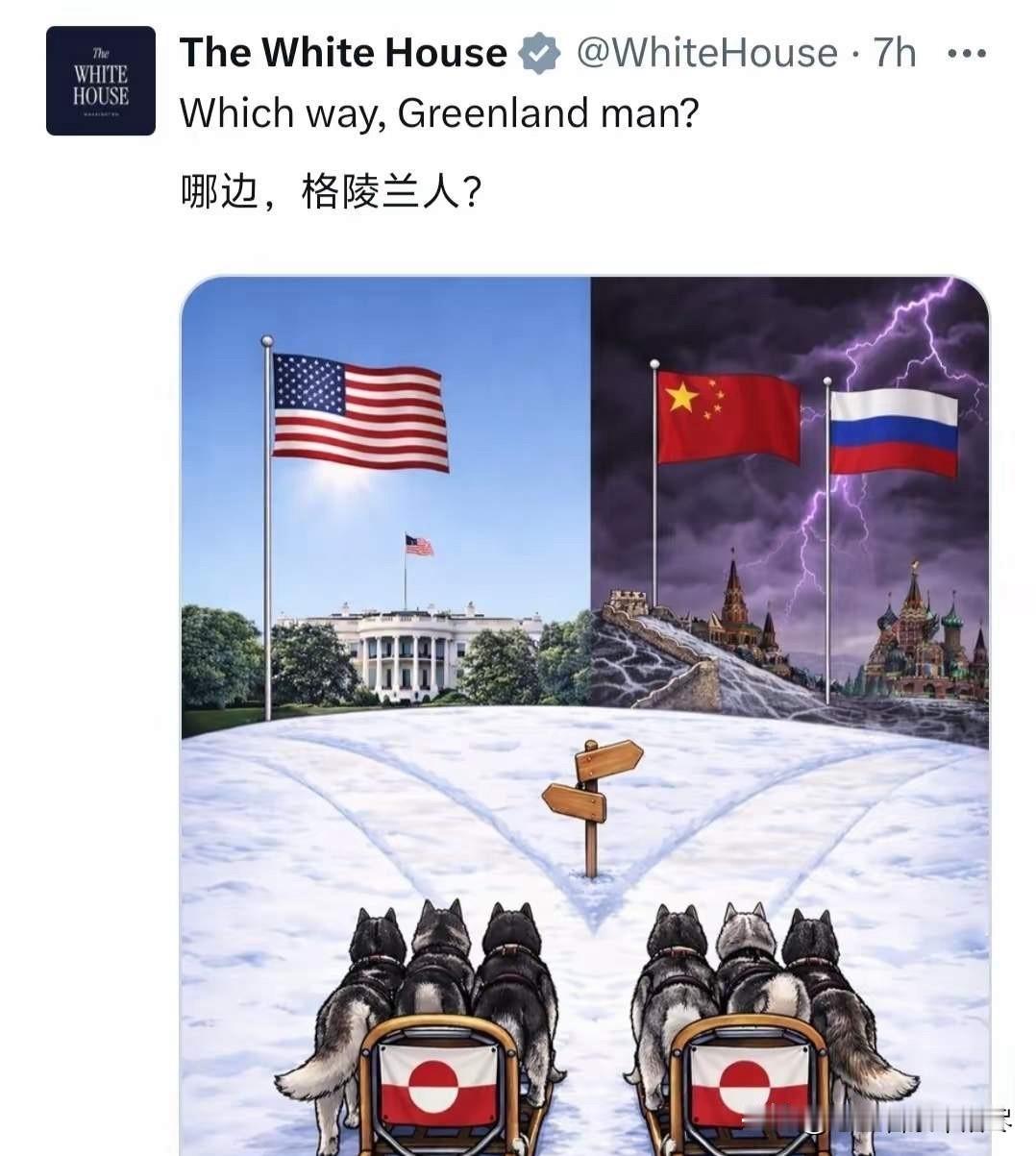 真是见过不要脸的,但真没见过这么不要脸的!美国白宫官方社交平台发布的一张海报,内容是挂有格陵兰岛国旗的雪橇犬车队,停在一个岔路口面临着选择,一条路是通往美国的,而另一条路是通往中俄的,海报的配文是:哪边,格陵兰人? 不得不说发布这张海报的人,也是真够无耻的了,现在全世界的人都知道,是美国想强占格陵兰岛,可这张海报所表达的意思,莫名其妙的就把中俄给拉进来了,格陵兰岛能跟中俄有什么关系呢?很明显这就是拿着中俄来拉仇恨的,更过分的是难道现在的格陵兰人都不能选丹麦了吗?