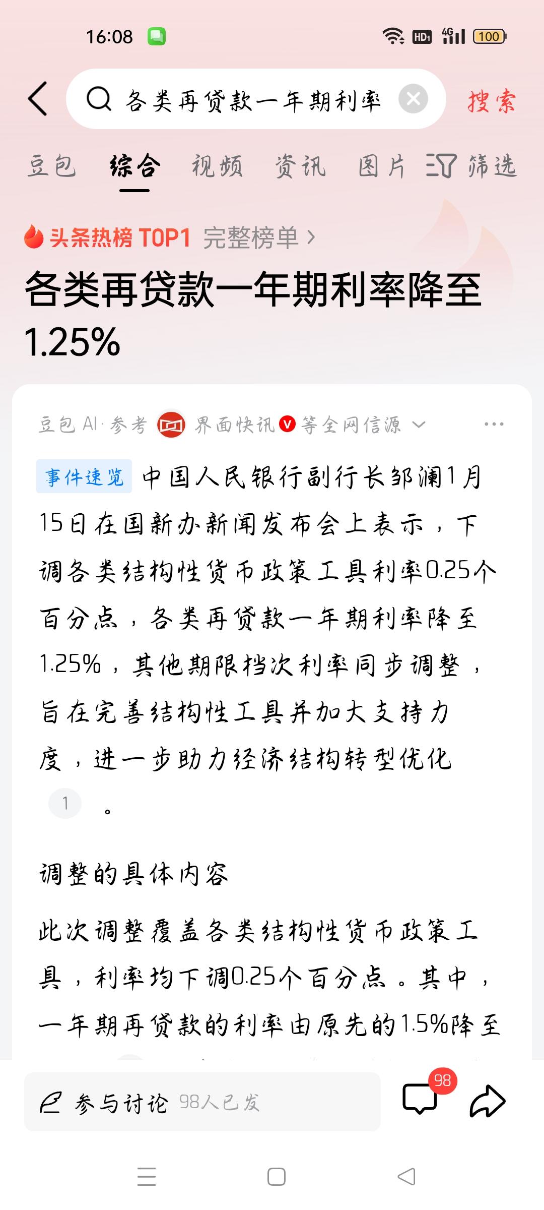 各类再贷款一年期利率降至1.25%,我想说 据界面快讯报道,1月15日,中国人民银行宣布,下调各类结构性货币政策工具利率0.25个百分点,各类再贷款一年期利率降至1.25℅,其它期限档次同步调整,旨在完善结构性工具并加大支持力度,进一步助力经济结构转型优化,我想说,贷款利率下降利于创业者创业,利于各种经济创新,减轻贷款者的负担,利于科技创新。当然,贷款利率下降,意味着存款利率也会下降。居民理财何去何从?是一个挑战。各位条友觉得呢?