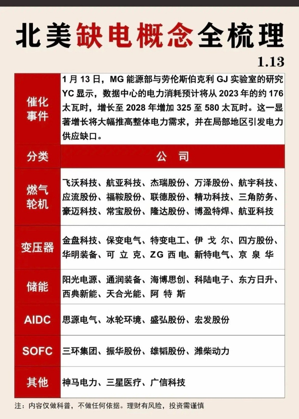 北美缺电:电力+智能电网 产业链!1月13日,美国能源部报告,美国数据中心电力短缺,尤其是AI电力需求爆发。相关电力设备,发电概念受益:1.燃气轮机2.储能3.SST固态变压器4.可控核聚变