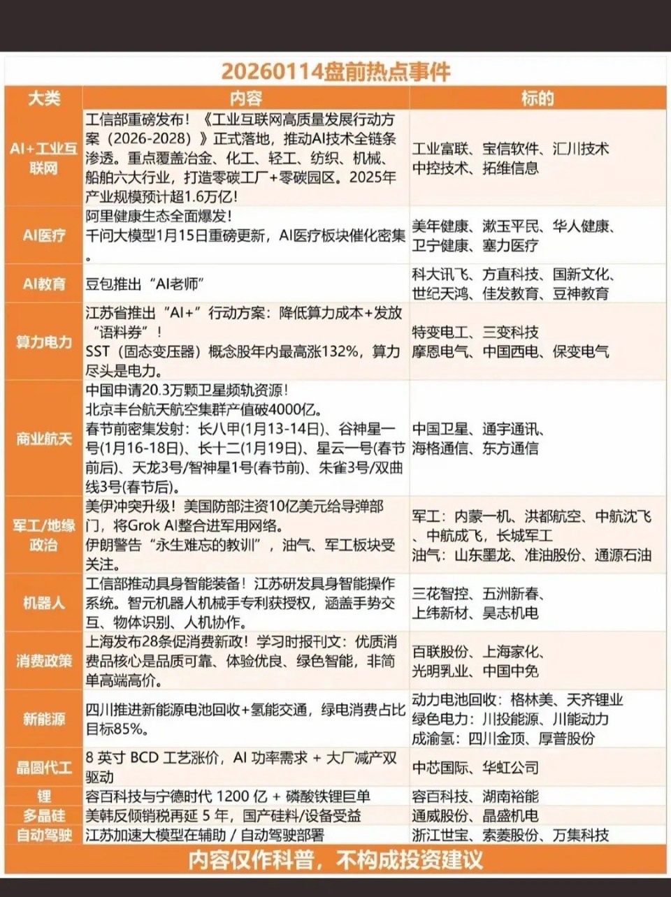 1.14周三 最新:财经热点事件!1.工业互联网+AI2.智能体AI应用,AI医疗3.算力电力4.晶圆代工,多晶硅5.机器人,自动驾驶