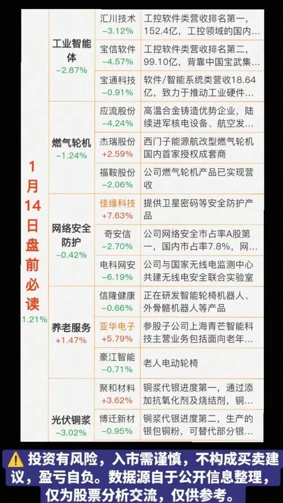 1.14周三 盘前 财经热点必读!1.工控软件,工业智能体2.网络安全3.养老产业4.燃气轮机,电网设备5.光伏铜浆
