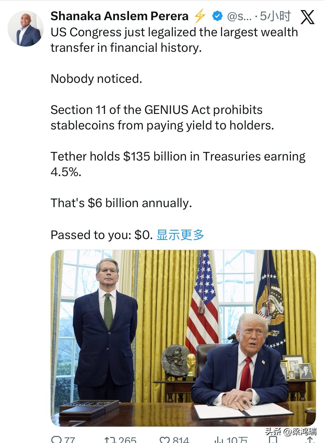 美国国会刚刚通过了金融史上最大规模的财富转移合法化法案。 没人注意到。 《GENIUS法案》(全称《引导并建立美国稳定币国家创新法案》)第11条禁止稳定币向持有者支付收益。 Tether 是一家金融科技公司,成立于 2014 年。它是全球最大稳定币 USD₮(USDT)的发行方。Tether 的核心业务是发行与法定货币(主要是美元,也有欧元、人民币等)或其他资产(如黄金)1:1 挂钩的加密货币,旨在为加密市场提供价格稳定性和流动性。 Tether 持有价值 1350 亿美元的美国国债,收益率为 4.5%。 那可是每年60亿美元。 已支付给您:0 美元。 Tether 会保存所有信息。 法律强制规定。 由国会授权。 情况变得更糟了。 2026年1月1日:中国启用计息数字人民币。 美国数字美元:收益率0%(已禁用) 中国数字人民币:收益率0.35%(已启用) 对于巴西、尼日利亚、印度尼西亚的每一位选择使用结算轨道的商家: 美国收取美元持有费用,中国则支付人民币持有费用。 这就是如今“美元主导地位”的体现。 精明的投资者已经看到了这一点。 贝莱德旗下BUIDL:资产管理规模28亿美元,年化收益率4.9%;富兰克林旗下BENJI:资产管理规模8.49亿美元,年化收益率4.9%。 同样由国债担保,不同的法律包装,持有者可获得全部收益。 机构资本正从零收益的稳定币转向有收益的代币化国债。 《天才法案》无意中创造出了扼杀自身创造物的产品。 国际清算银行第1270号工作文件对这种不对称性进行了量化: 资金流入35亿美元:收益率下降2.5个基点;资金流出35亿美元:收益率飙升8个基点。 比例为1:3。 稳定币发行方没有美联储的支持。没有折扣窗口。没有最后贷款人。 一场信心危机迫使财政部抛售1350亿美元资产,而且没有任何补救机制。 国会制造了一颗炸弹,却称之为监管。 《天才法案》并没有确保美元的霸权地位。 它创造了两个金融世界: 一人从持有者那里提取收益。一人将收益分配给持有者。 美国选择了掠夺,中国选择了分配。